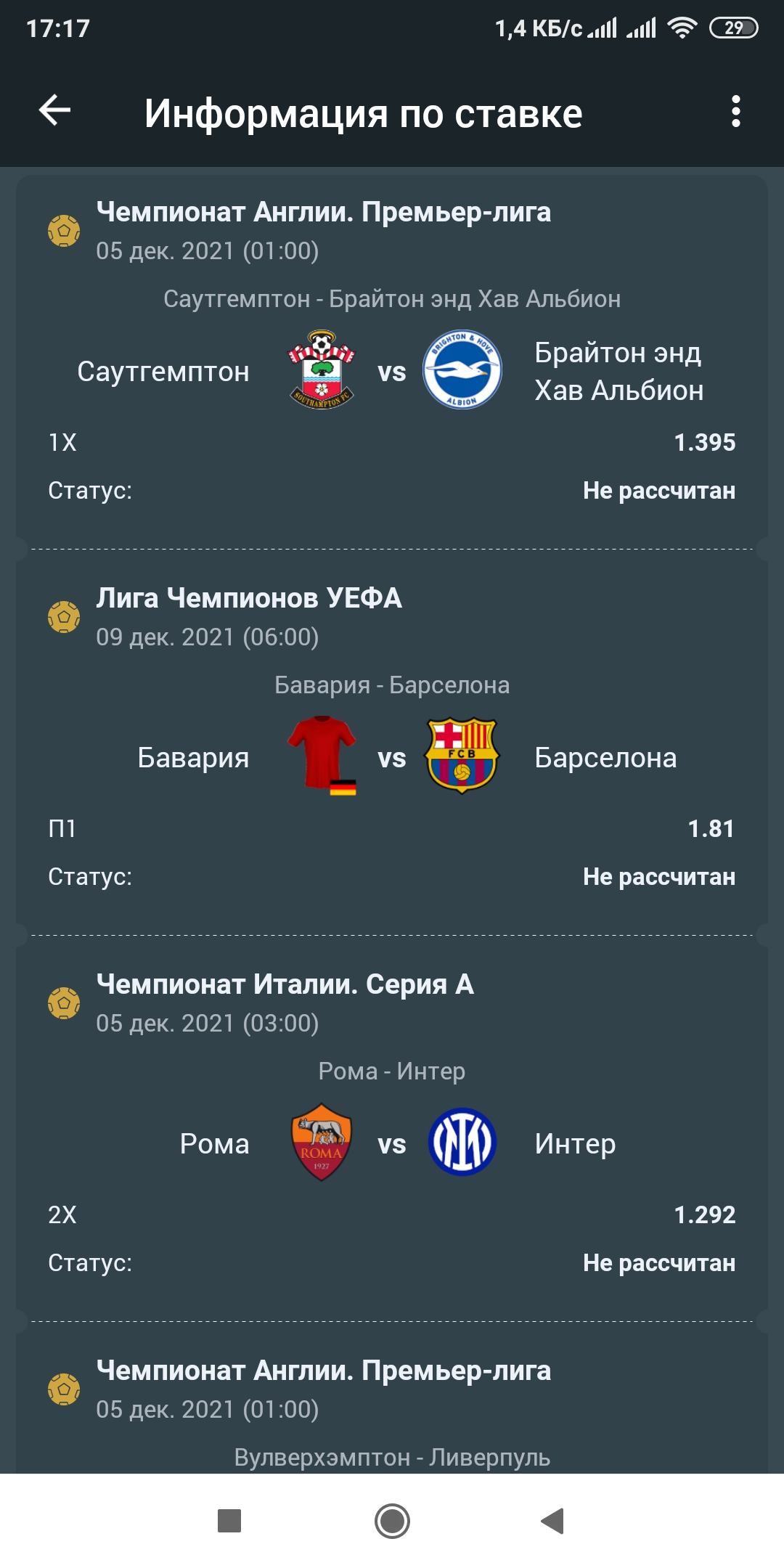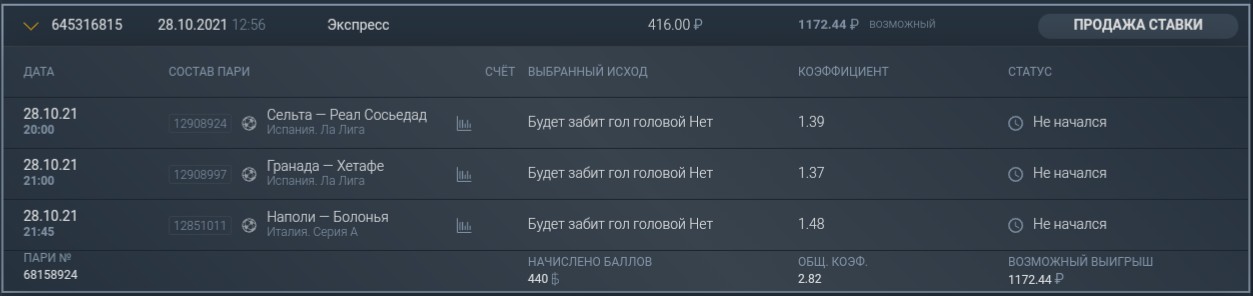 Теперь что касается моих изысканий. С последнего поста >>47906 прошло 5 ставочных дней. 29 сентября была небольшая прибыль в пол-флета. С 30 сентября я немного изменил режим работы. Разделил свои прогнозы на 3 части: - то, что я беру в экспрессы - самые уверенные ставки по линии; - интересные ставки по линии на не самые очевидные для меня матчи, кэфы повыше; - лайв Реальные деньги пока по-прежнему ставятся экспрессами на первую категорию матчей, но скоро я походу проиграю всё (осталось 88 рублей 38 копеек) и окончательно убежусь в необходимости применения флета.