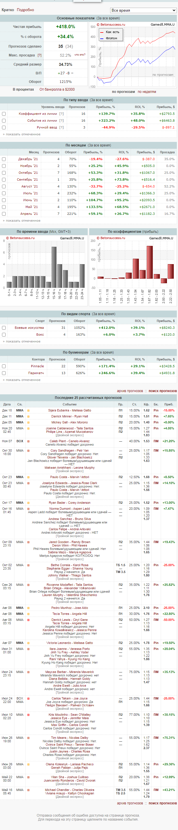 >>48095 Тут роль играет на что ставишь, хз как с теннисом или футболом, но я чисто погружен в юфс и бокс и очень давно ставлю, у меня много рассылок, я сам протестировал уже с пару десятков систем и абсолютно убежден - единственный способ играть в нормальный плюс - это из огромной выборки находить варианты в которых ты уверен что они пройдут, не пытаться поймать коэффициент, тебя должна интересовать только проходимость, не нужно распыляться на много вариантов, один-два варианта в неделю, это также железное правило, иногда тебя прям манит, ты начинаешь думать про все бои, думать что тут возможно этот победит, я его заберу, НЕТ, железно нужно избавляться от такого мышления. Реально беттинг - это про сдерживание, нужно научиться себя сдерживать. Конечно без системы анализа никуда. Вот скоро на этой неделе дерется Бейдер - Андерсон, я вообще не понимаю с чего ради на ниггера дают 1.52, попахивает тем вариантом в который можно вгрузиться