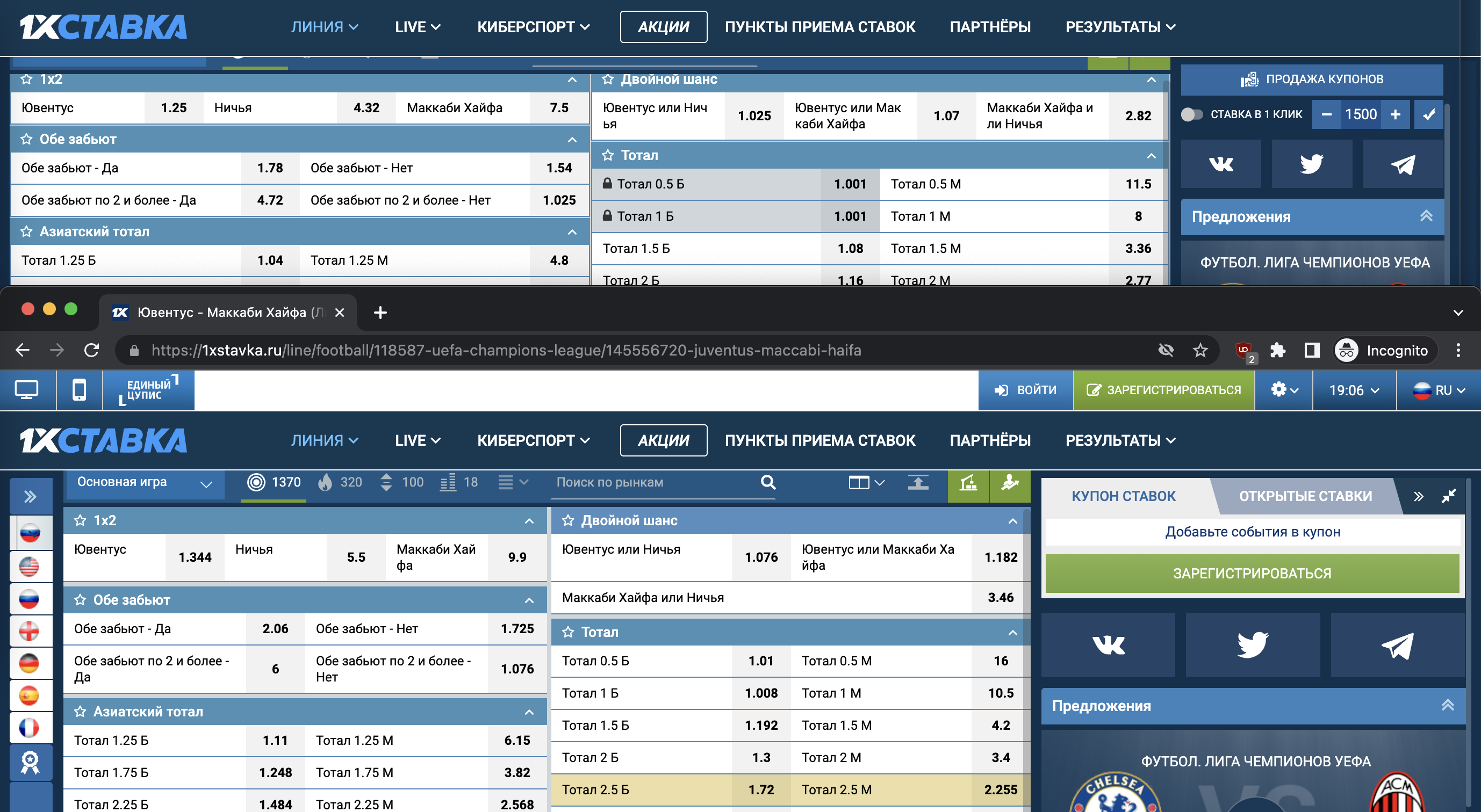 Аноны, подскажите, словил какую-то хуйню в БК "1хСтавка" - пидоры порезали мне кэфы хз за что, поддержка сослалась на пункт 3.4 (типа букмекер может взять и изменить кэфы аккаунту без объяснения причин). Ловил кто подобное? Долго ли такая хуйня длится? Или они просто так по-пидорски плюсовые аккаунты делают чуть менее плюсовыми? Не вилочник, ебашу экспрессы по 8-12 в день, всего четвертые сутки, завёл 50к, вчера баланс доходил до 64к (позавчера сделал +142% от суммы ставок), сегодня утром дернул чёрт пойти в лайв, где я насосался хуёв, но всё равно остался в плюсе, банк упал где-то до 57к, плюс-минус. Но зашёл поставить экспрессы, и заметил на играх ЛЧ, что кэфы понизили заметно (открыл вторую вкладку в инкогнито - и там форменный пиздец, пикрил). Это вообще пройдёт? Или лучше выводить бабло и идти в другую БК? В какую лучше завести?