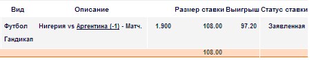 Касательно игры ожидаю газ в пол от аргентинцев с первой минуты, так как им надо побеждать и желательно с как можно лучшей разницей. От нигерийцев жду быстрых контратак (исполнители у них есть и им тоже нужна победа). Вероятно зайдет ОЗ.