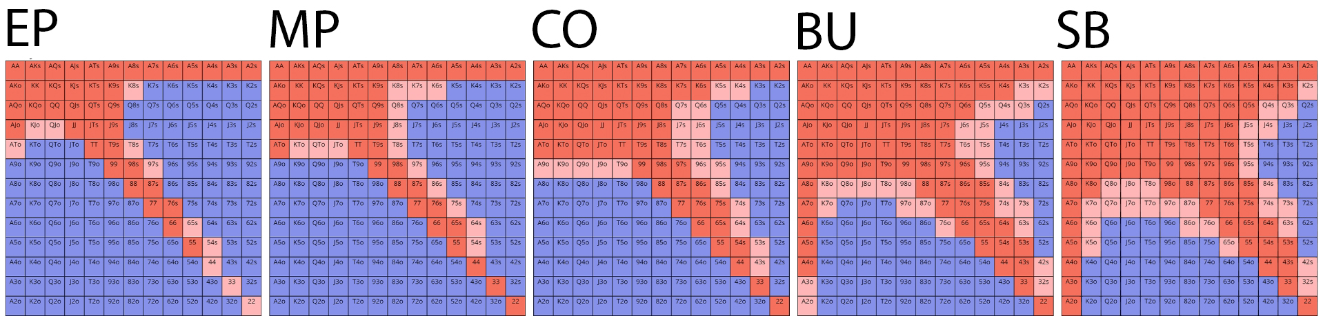 Недавно начал играть в покер, стартанул с МТТ, но понял, что не мое. Хочу перекатиться в кэш, возникла закавыка с опен-чартом. В туриках как-то всё поочевиднее было. Какой тип тайт/луз/стандарт лучше юзать в реалиях Зум НЛ2 на старзах? Качнул пикрелейтед чарт, не слишком ли он лузовый, особенно в плане разыгрывания из ЕП/МП одномастных тузов с мелкой второй картой и одномастных коннекторов? Если чарт говно, поделитесь плз ссылочкой на нормальный. Понятно, что чарт - штука условная и должен корректироваться, но начинать плясать-то нужно от чего-то. Алсо, нормально ли лимповать всякую проходную шнягу, типа тех же коннекторов и мелких пар или лучше опираться на рейз/фолд? Какой разрыв ВПИП/ПФР сегодня считается допустимым на микролимах? В качестве подготовки прочитал книжку Crushing the Microstakes. Если кто знаком, подскажите, какая инфа из нее на данный момент неактуальна. Насколько я смог понять, там слишком большой бетсайзинг для сегодняшних реалий, может еще что-то уже устарело.