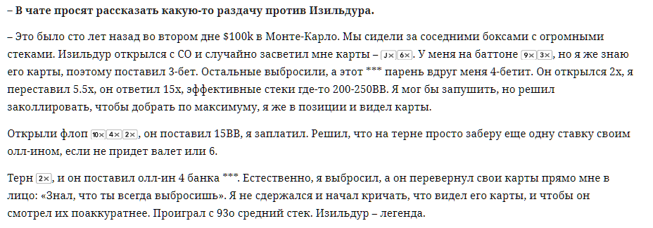 Кстати, сейчас опять вылетел с этих BOUNTY BUILDERS (не турбо, с ебучим выбиванием). На руки приходил сплошной мусор типа "7-3" или "J-2", в итоге за 2 часа игры сыграно до флопа раздач 12 из 100, два раза успешно сходил в олл-ин с AQ и JJ, и на третий олл-ин с АА вылетел против двух оппонентов, одной скотине с Q9 пришли ещё две девятки. Брат жив, очко булькнуло немного.Впрочем, ещё 9 лет назад, ещё щеглом-первокурсником, играл на олдовом Full Tilt Poker до его закрытия, катал там турниры для бомжей и как-то просидел с 10 вечера до полшестого утра, в итоге обосравшись и заработав целых два бакса, отличные были времена
