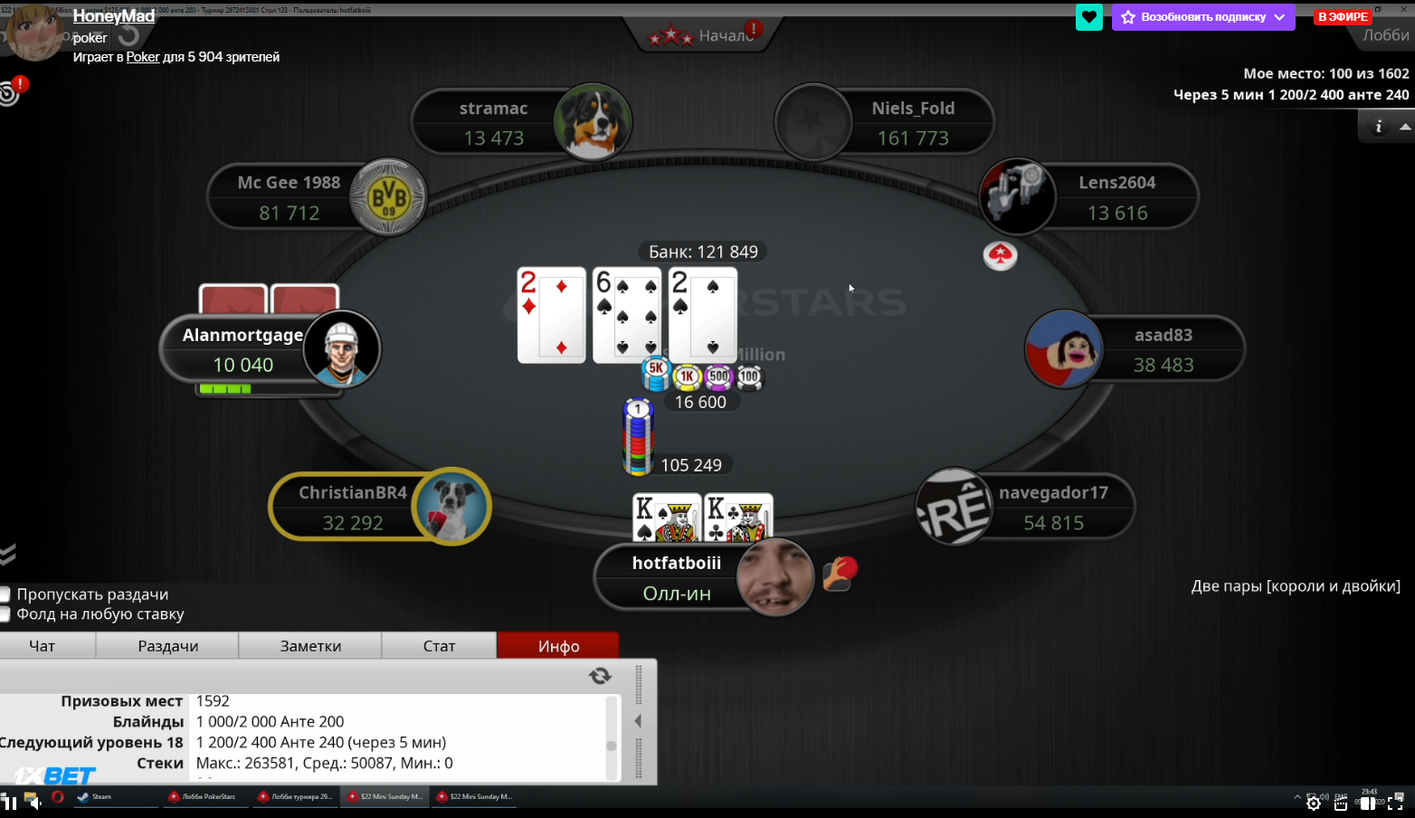 Хочу научиться играть в турниры, помимо кэш-столов. В принципе эта дисциплина мне интересна, но меня всегда отягощает, что ограниченное количество фишек. Когда я смотрю в турнирную таблицу, у некоторых уже 40к фишек, у меня же максимум 10к. Я стараюсь их догнать, перестаю играть тайтово, разыгрываю больше рук из-за чего начинаю делать ошибки. Еще отягощает то, что блайнды и анте сжирают стек, и когда они растут играю еще лузовее и еще больше ошибок совершаю. В один момент просто делаю ол-инны на отъебись. То есть играя тайтово, как пишут в большинстве статей - в итоге я так долго не продержусь. Есть какие-то действительно годные ВОДы или статьи? Уже все перечитал из доступного у пекарстас, покер стратеджи. Там даются только базовые понятия. Или может Вы мне объясните, как так получается у тех игроков собирать такие большие стеки за такое короткое время? Надеюсь нормально сформулировал мысль, а то тяжело объяснить, что чувствую играя в турнир.