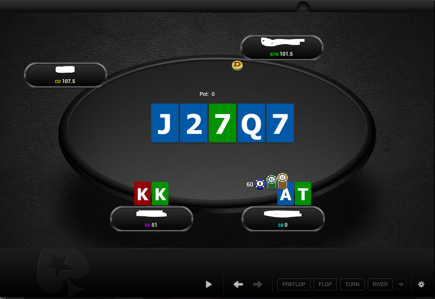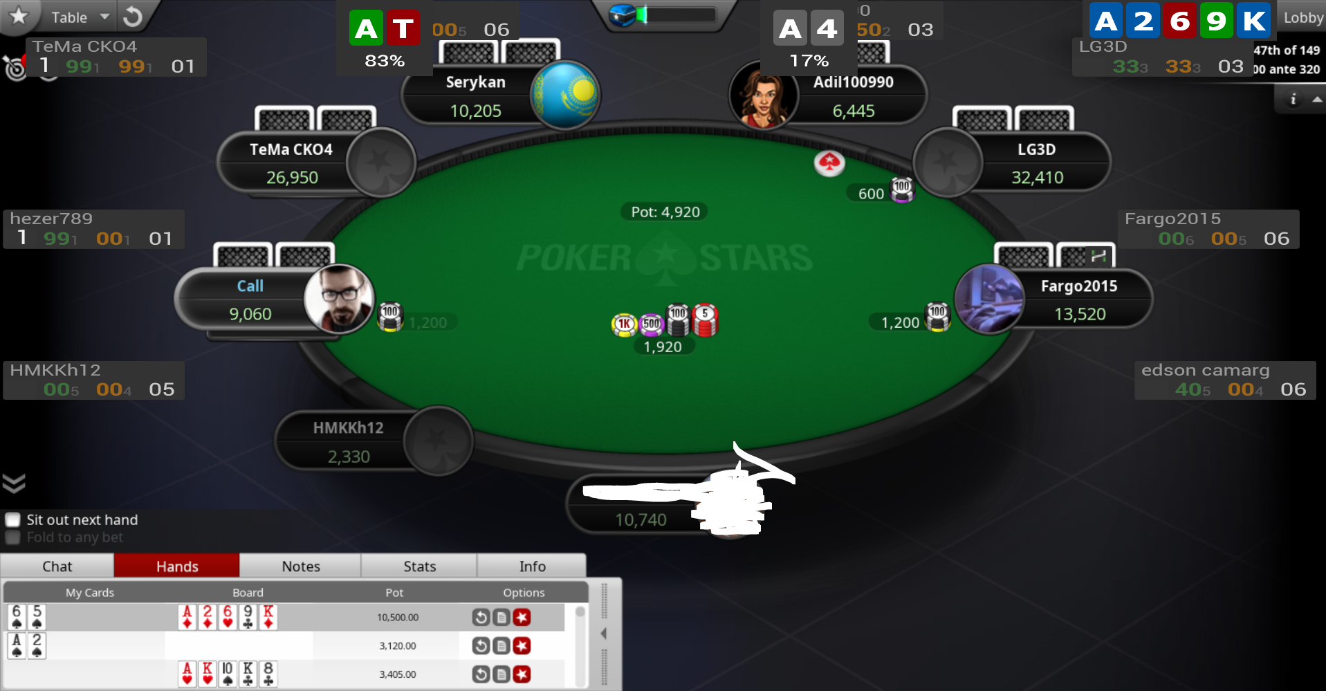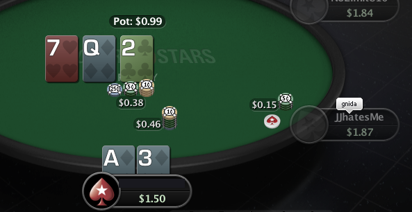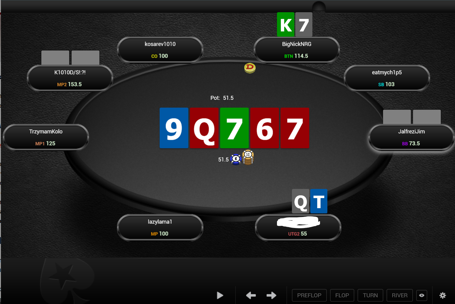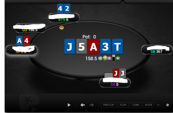 Охуенный доезд. Ну хули, ктож знал, ктож знал. Видимо рейзы в 6 бб слишком слабенькие, чтобы отпугнуть людей не попавших в флоп. Эти Потом он рейзнет, я заколлю и минус бабло. Ну хоть начальный стек не проебался. Ну долбоеб я, хули делать.