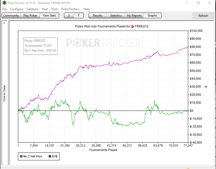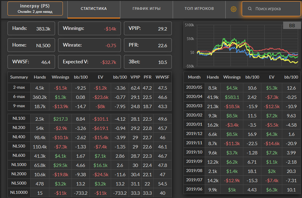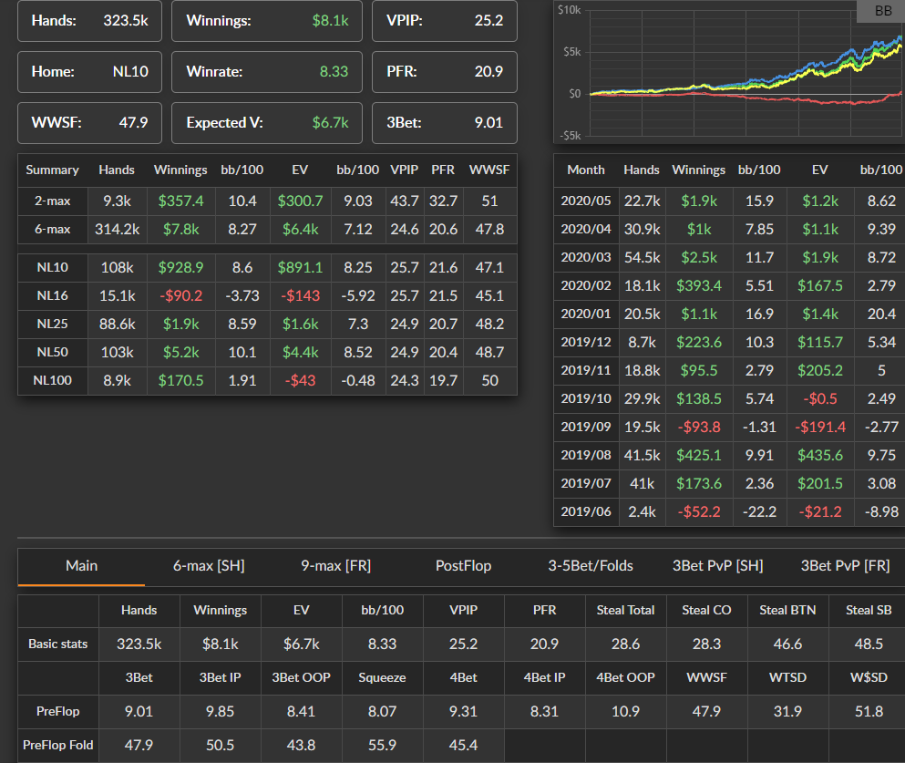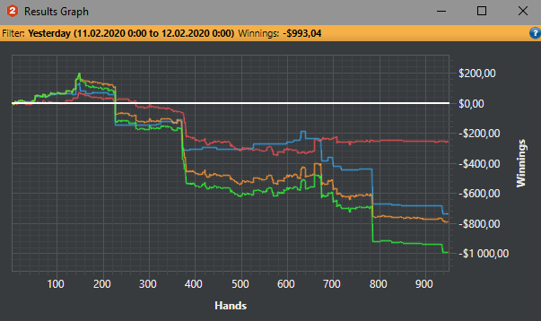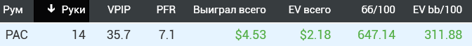Пиздос. Подвёл итоги месяца. Не играл очень долго. Только в этом месяце начал, причём разу полез на NL100. В итоге сыграл всего 21к рук. По EV всего 1,2bb/100...РБ ещё 250$ получил. Вместо это ~500$. Печаль лютая. Я думал, сейчас буду как раньше лимиты рвать и хотя бы 5-7bb/100 иметь, а тут такое. Сейчас вот базу разбираю и руки. По красной какой-то лютый залив идёт. Думаю придётся тренера брать, чтобы в этом аспекте подтянул, иначе пиздец какой-то. Ещё месяц, конечно сам попытаюсь, но если не пойдёт, то придётся искать кого-то. Кто сейчас не очень дорогой и годный?
