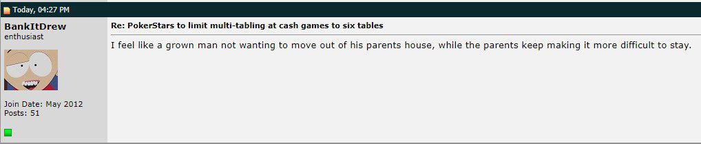 >>42701 About 3 years ago PokerStars instituted a policy where they no longer allowed any sort of analysis software to be active while their client was open. People who breached this rule, even if by accident, received warning mails (from PokerStars). By the request of our clients we have added restrictions to Flopzilla so that, from v179 and higher, Flopzilla no longer for performs calculations while PokerStars is active. By adding these restrictions, you will now again be allowed to have Flopzilla open while PokerStars is active. However, most features will not work. This is in order to protect our users against having their account frozen when they have our software open by accident. So the PokerStars restriction is not a feature; it's there to protect you against your account being frozen when you accidentally breach their Terms and Conditions. We apply similar restrictions in all of our softwares, and so does everyone else.