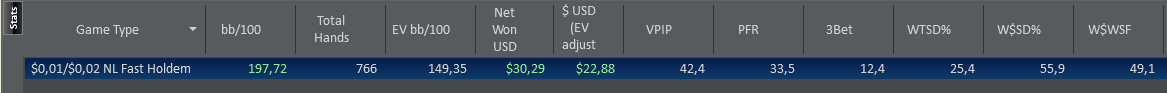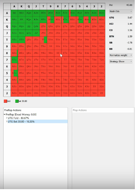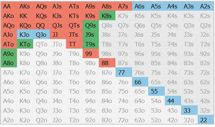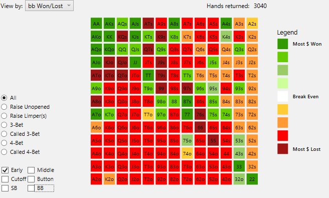 >Играешь тайтово. Даже для FR. Но я пока не вижу смысла тайтиться мне самому. Я лузоват, но скорее из-за того, что шире под фиша на bb открываюсь (почти 25% из UTG). Я разобрал свою базу за много лет и оставил в открытиях только те руки, которые уверенно плюсовали. Околоноль и всё красное просто выкинул, чтобы не морочить себе голову и сократить количество ненужных телодвижений. С тех пор просто собираю деньги ровной зелёной.