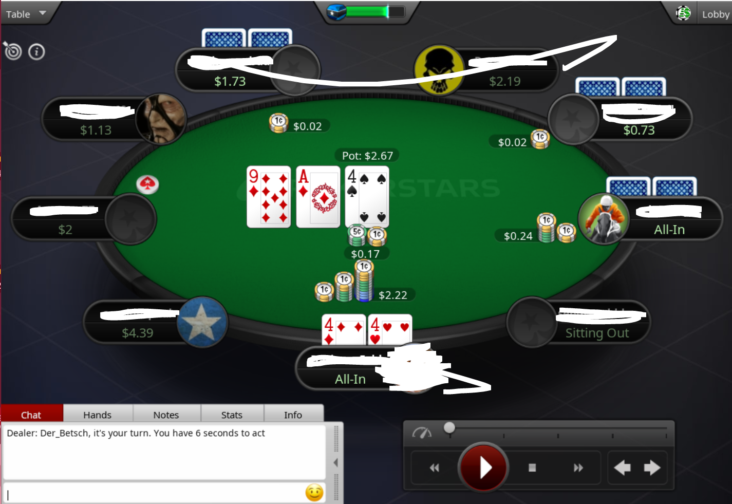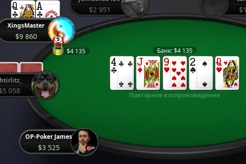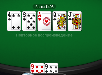 Щас прибил мамкиного блефовальщика с QJ, имея на руках 44 и другой игрок(Справа сидел) сказал типо Hehe Nice hand