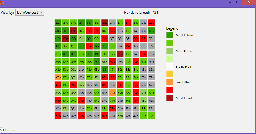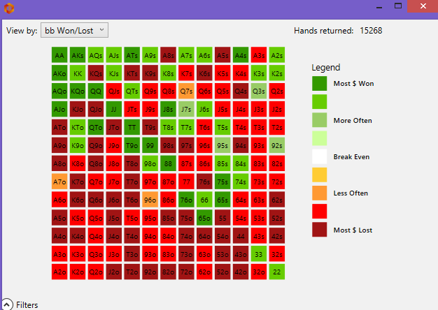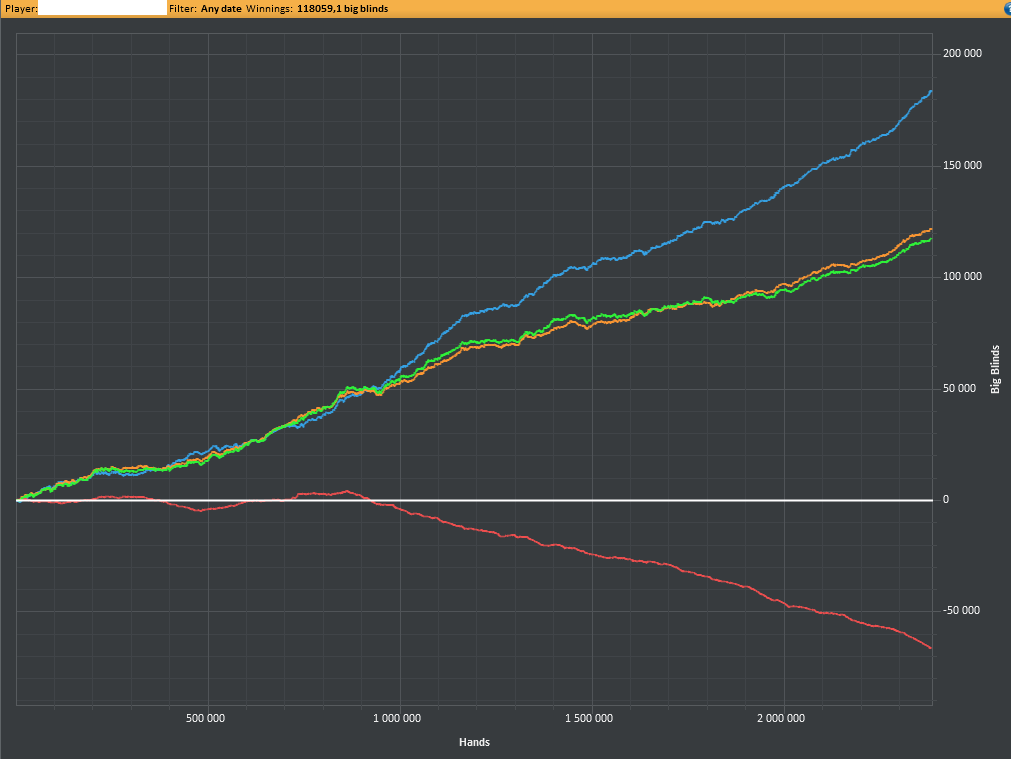 Алсо, у тебя A2o-A8o в минус играются. Ты уверен, что не переигрываешь их где-то? И ещё заметил что в некоторых ситуациях не веришь агрессии фишей и делаешь слишком лузовые коллы, или наоборот блефуешь слишком широко. И ещё странно, что у тебя изоляция с SB выше, чем с BU, хотя на SB она по сути должна быть намного ниже и часть рук обычно уходит в оверлимп. Но это всё мелочи...