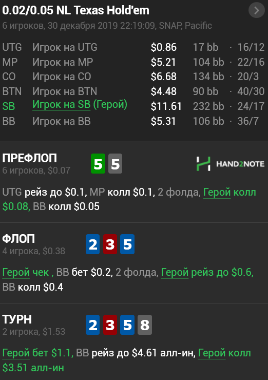 >>44299 > Нахуя ты из utg такую слабую руку открываешь? Чому нет? Я лимпанул, они не рейзили. Люди там опастливые, да и мультипот был. А чем больше людей тем меньше шансов у сильных рук и прибавляются возможности слабых рук. Даже АА в мультипоте частенько сосёт хуй. > Нахуя тв ставишь кбет флопе с отличной ркой для чекбэка? У меня топ-пара собранная на борде, никто не агрессирует и не 3бетает. Чому нет? Возможность собрать сет у того челика 11%. У меня тоже есть возможность на сет или две пары. Борда не опасная. (Почти, ибо есть вероятность стрита)