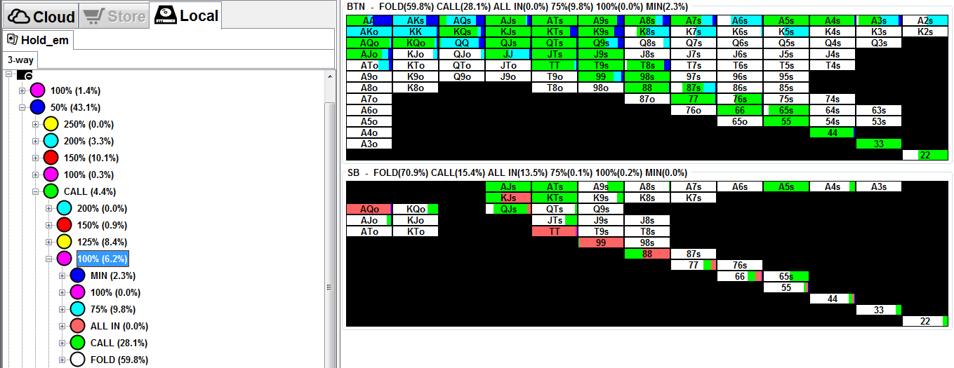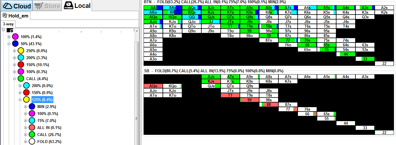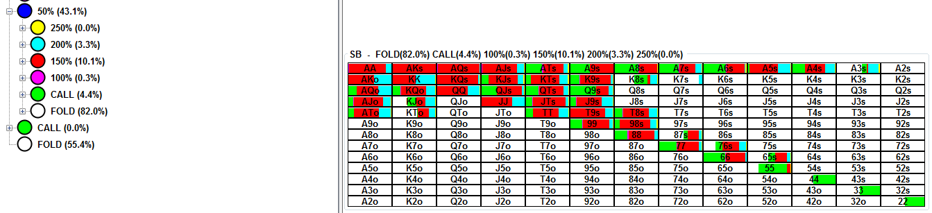 >>44548 Солвер может играть как хочет. Это не истина. Задай разные сайзинги опенов, разные диапазоны опенов у оппов и ничего не будет работать. Я просто убрал колд-колл стила на SB в ноль, кроме случаев, когда фиш на BB. Всё равно я не вижу, как оппы могут это эксплойтить, кроме какого-то агро-макакинга на постфлопе. У меня ещё нет нужной базы, чтобы понять какие руки рестилятся в минус, чтобы что-то убирать. Пока все руки из разных категорий в среднем в плюс идут. Я составлял диапазон с учётом неэксплойтного фолда на 4бет, покрытия досок и максимальной линейности. Посмотрим.