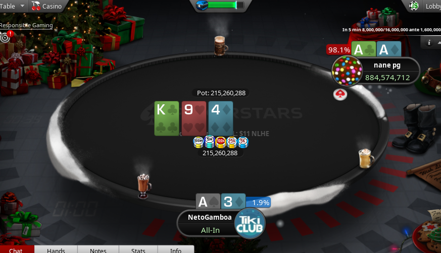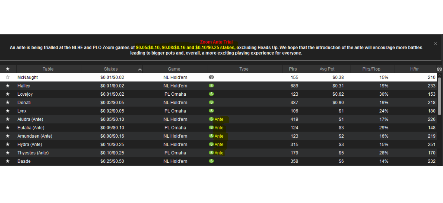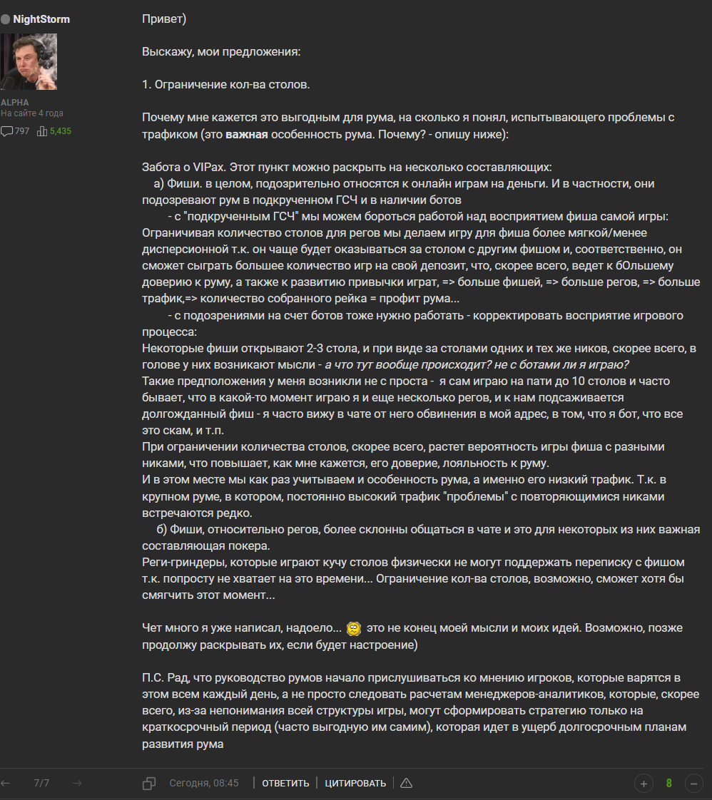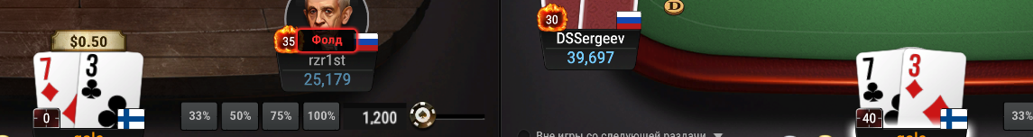 Кстати да, старзам нужно сделать на высоких лимитах игру анонимной. А то это выглядит отвратительно как под одного фиша собирается на 2 стола человек и сидят между собой чек-фолдят. Это же реальный тимплей, за такое банить надо.