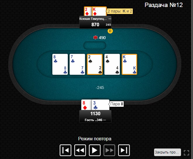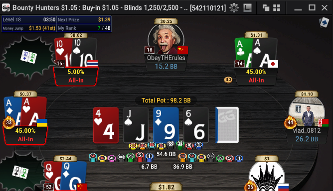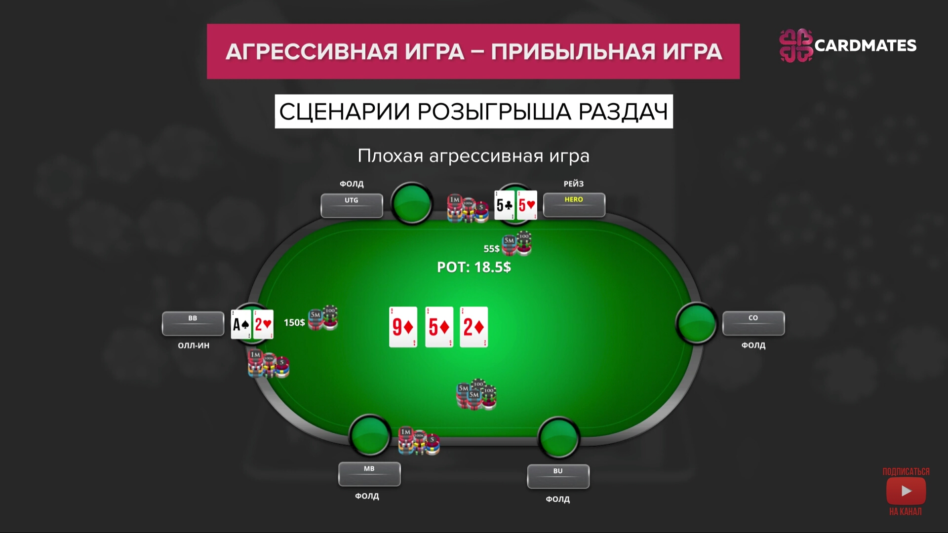 2) чем меньше игроков тем больше у тебя выйграть шансов если ты играешь по первому правилу. Шанс затащить раунт 50 на 50. Проигрался - рейзуй и выводи противника чтоб отыграть деньги Рейзуй каждый ход чтоб он ахирел. Будь уверен он не сразу поймет что ты делаешь. увеличивай свой банк на 10 процентов Вкатился с 10к. задай планку 11к Рейзуй так чтоб аппонент потерял 1к. Если начал так играть, ни когда не играй на эмоциях. не рейзуй больше положеного даже если на руке каре, Введи противника в ступор, для него игра покер это сказки про интуицию и всякие зрачки и подергивания уха. Ты просто знаешь что это математика, и нужно ее только обратить в свою сторону. 3) хорошенько узнай правила игрового стола. 4) чем больше игроков за столом, тем меньше полагайся на стол.