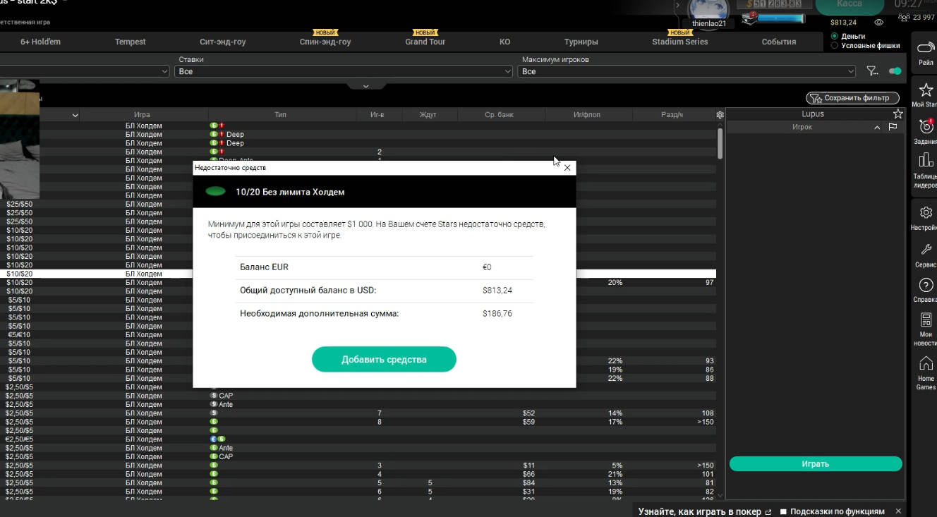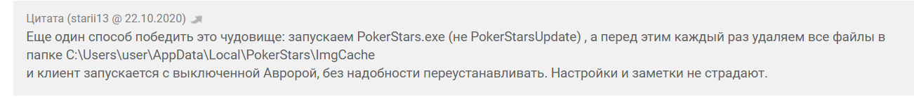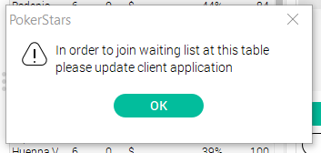 Выскакивает при попытке войти в вейтинг лист любого стола. При перезапуске клиент не обновляется, экзешник PokerStarsUpdate в папке тоже ничего не делает. Может быть такое, что это меня наказали за то, что я очень много заходил в вейтинг листы и не принимал?