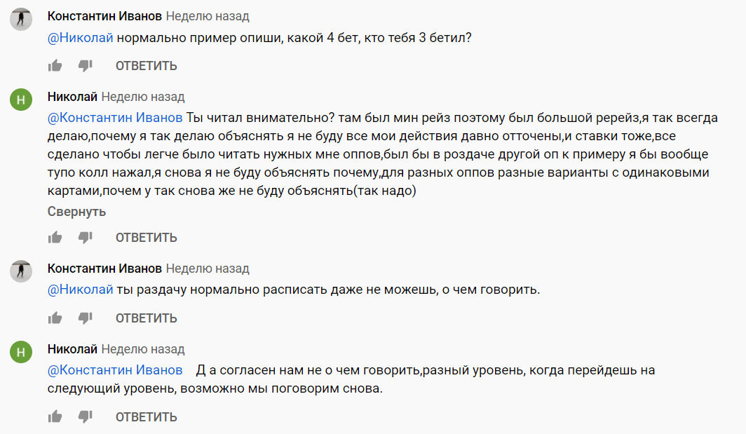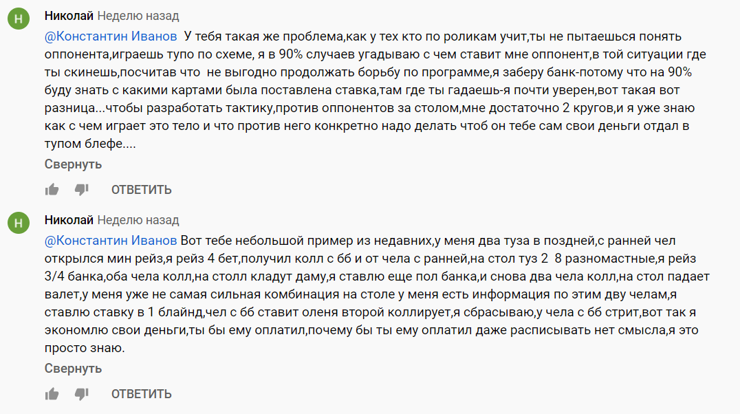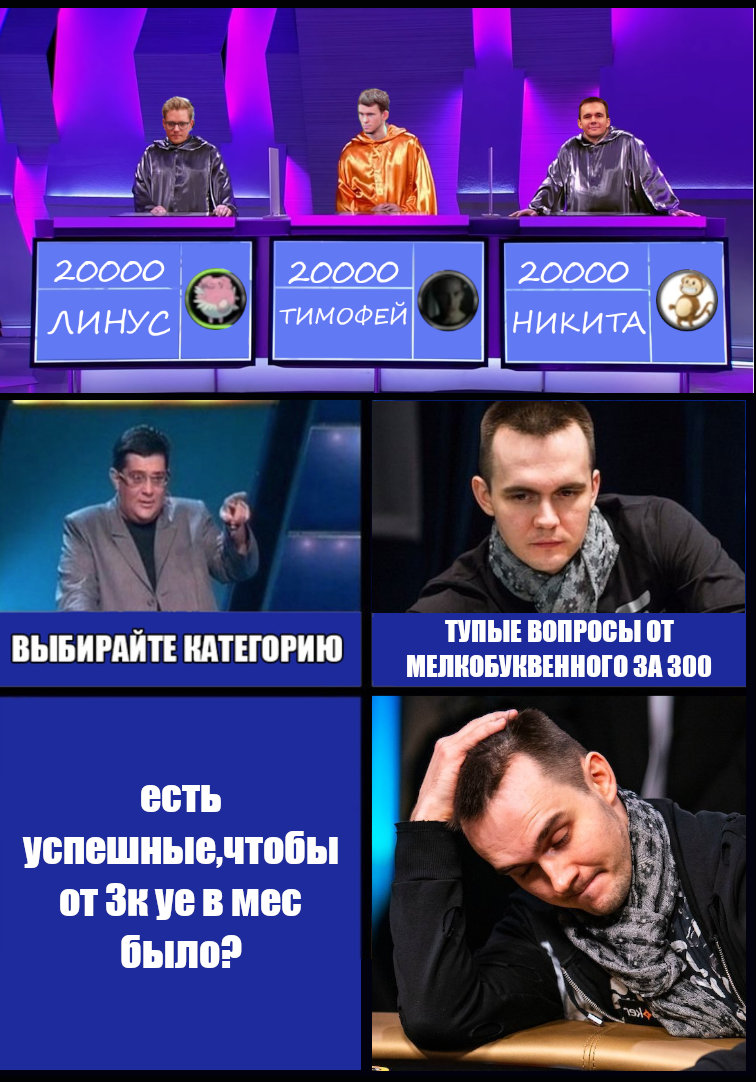 >>44643 Да я уже давно говорю что в хайроллерах нубы одни сидят, у которых просто денег много, а уровень игры там нулевой. Пускай линус-пинус попробует на моих нл2 поколить по десятой паре аллины или поблефовать >>44595 Его там быстро в чувство приведут. А вообще чтобы честно всё было я предлагал найти рега микролимитов, дать ему бр хотя бы на нл200 и застримить это дело. Как пример тот же Гантвер который катает мелкие турики, а когда напьётся идёт в 530-ый и разносит там поляну. У меня ещё есть клип где Veea тоже говорит, что он дохрена ошибок делает и заносит сандей миллионы.
