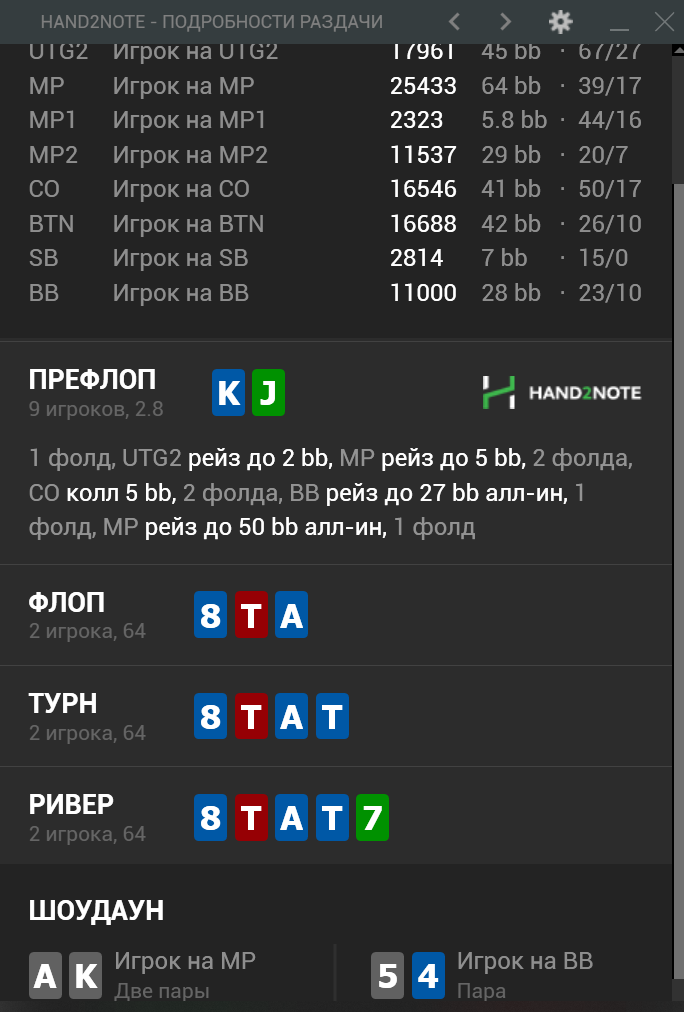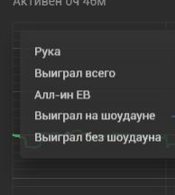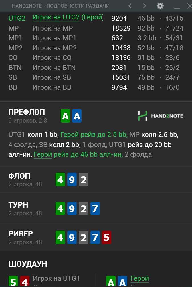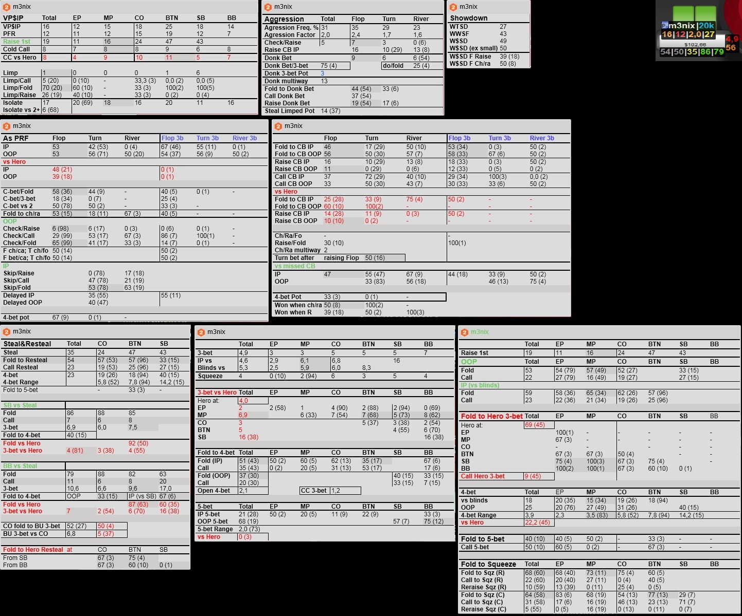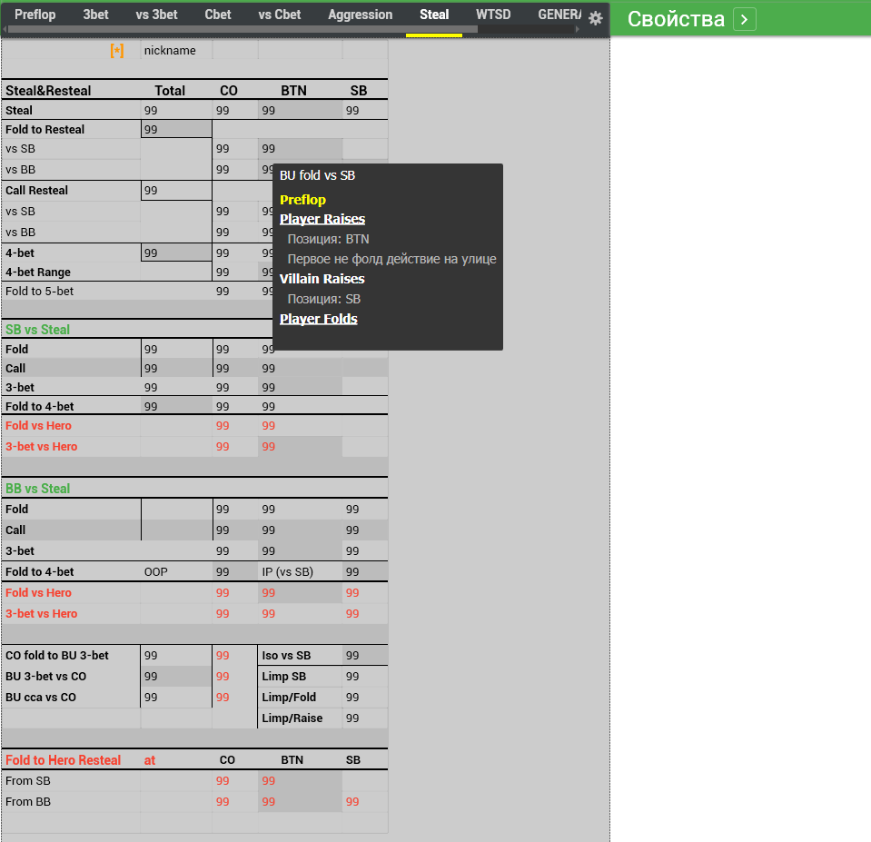 Посоны, кто делал свои статы в H2N у вас всё нормально считает? Сделал себе попапчики и статы, но почему-то не всё работает. Вот например скрин. Это ведь обычный фолд BU на рестил с SB. Я не вижу ни одной проблемы тут. Но почему-то не все мои руки посчитались (я статистику очищал и пересчитывал уже). Сыграл на RedStar около 200 рук пока тестил HUD. И меня пару раз рестилили на этот стат, но в статах Хиро стоит прочерк, как будто этих рук и нет. Но проверил и они в базе есть. Есть даже эти же самые руки в статах рестила у оппов, а у меня в фолде нет. Даже сам стат у других опов показывает не прочерк, а нормальный фолд. Всё что между заданными игроками по дефолту считается за фолд, же. Я даже для теста добавлял сюда фолд BB, но это никак не повлияло... Почему не считает?