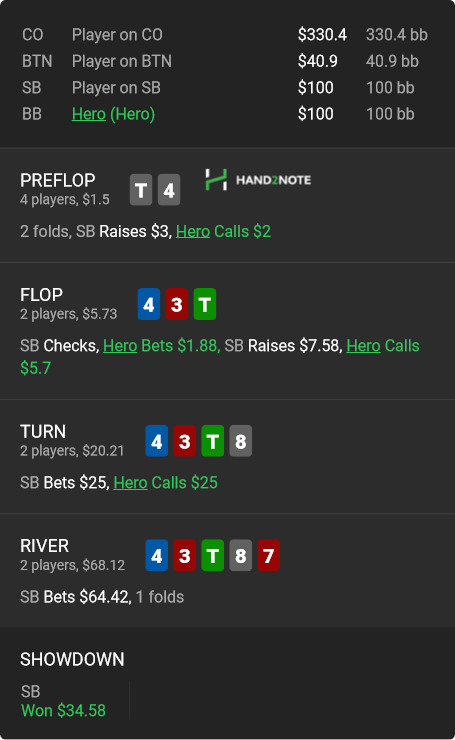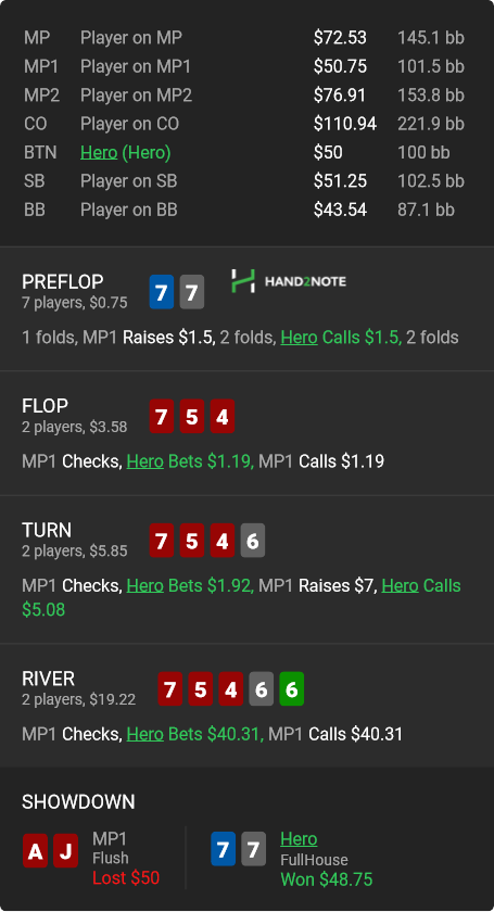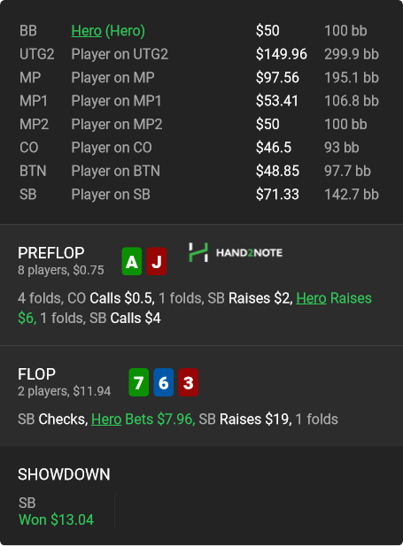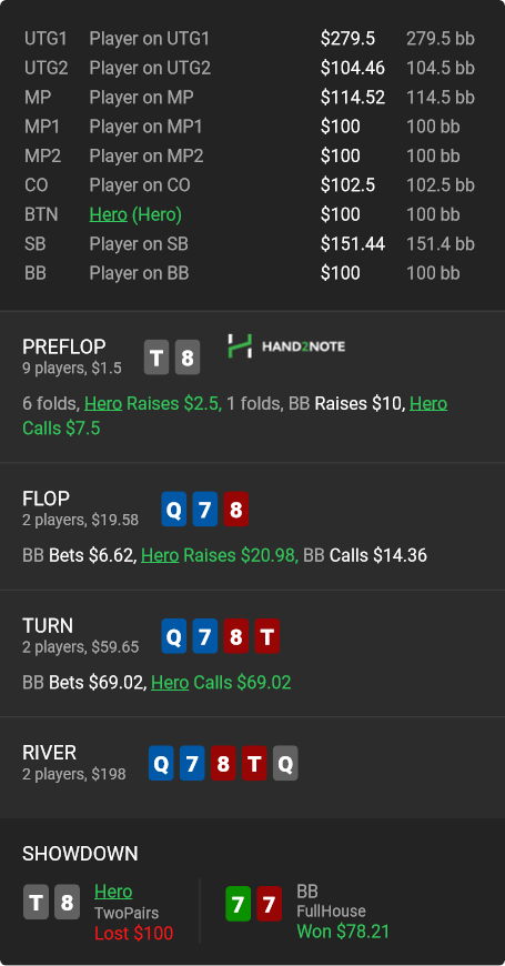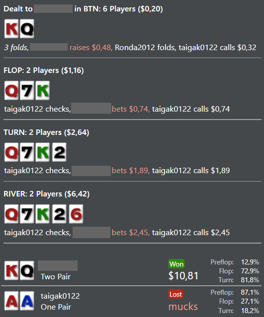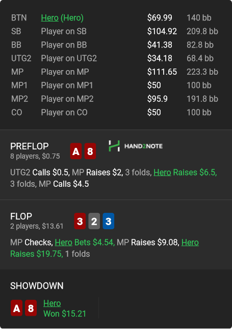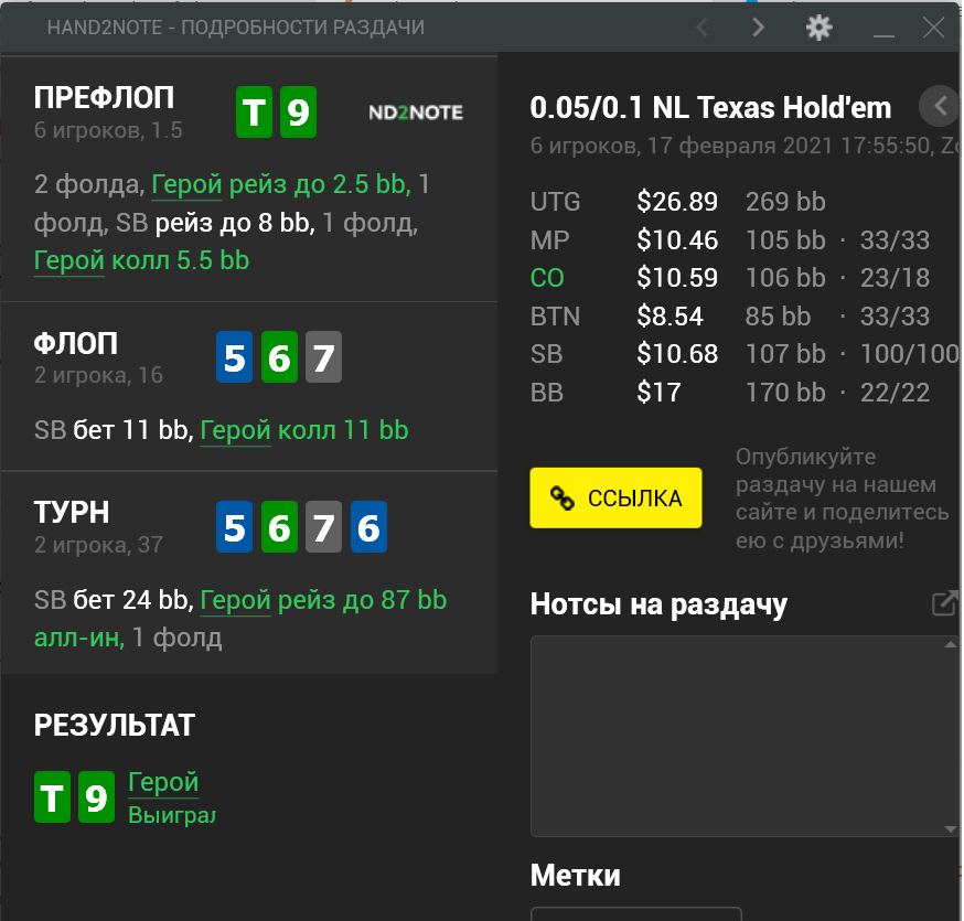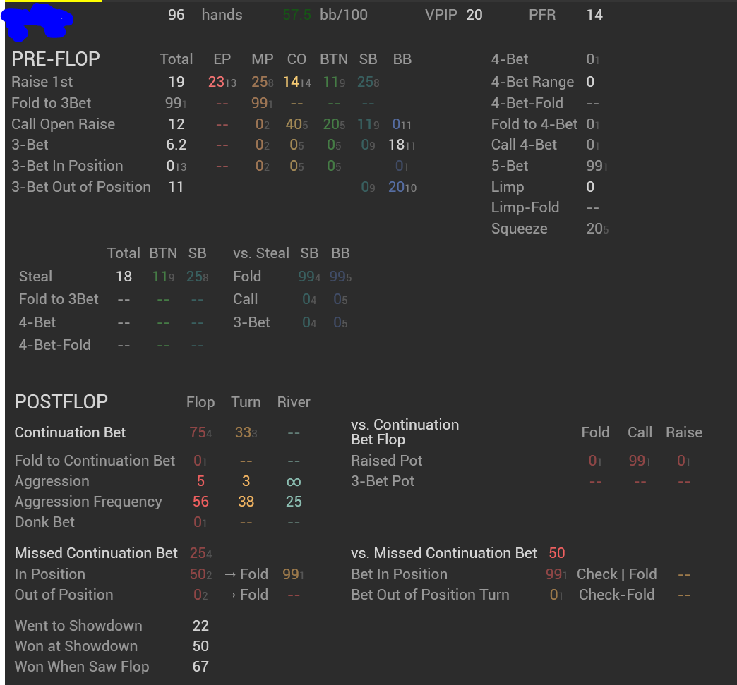 Посоны, кто делал свои статы в H2N у вас всё нормально считает? Сделал себе попапчики и статы, но почему-то не всё работает. Вот например скрин. Это ведь обычный фолд BU на рестил с SB. Я не вижу ни одной проблемы тут. Но почему-то не все мои руки посчитались (я статистику очищал и пересчитывал уже). Сыграл на RedStar около 200 рук пока тестил HUD. И меня пару раз рестилили на этот стат, но в статах Хиро стоит прочерк, как будто этих рук и нет. Но проверил и они в базе есть. Есть даже эти же самые руки в статах рестила у оппов, а у меня в фолде нет. Даже сам стат у других опов показывает не прочерк, а нормальный фолд. Всё что между заданными игроками по дефолту считается за фолд, же. Я даже для теста добавлял сюда фолд BB, но это никак не повлияло... Почему не считает?