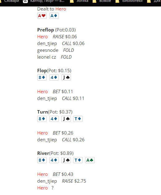 >>49072 У любителей всяких гавнокурсов от всяких БеновСБ треснет срака от попыток объяснить зачем бетать 1/2 пота с АК и другими топ парами по 5 флешу, при том что сеты не вельюбетят, а всякие 5х не блефуют, это строго противоречит типичной логике. А ответ против 300% овербета так ваще мозг сломает, ведь любой тренер за миллиард баксов в час скажет, что нужно играть старшие флеши и фолдить младшие, определив границу частот колла. >>49073 Ничем, там кто-то возмущался, что не понимает действия алгоритма, который призван находить математическое равновесие по формуле, а не учить бестолковых фишей ебашить в картонки.