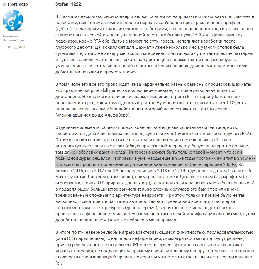 >>48441 >Ладно. Главное повторять это чаще, чтобы не слудоманиться. конечно, хорошая нейросеть любого человека поимеет запросто, ведь нейросети обучены на миллионах партий, а люди ошибаются. В том и суть, что например 90% людей в перманентных минусах просто. Много поднимать, даже 1к$ в день- такого рум тебе не даст, ну просто потому что умников очень дохуя, больше чем ты думаешь. У старзов тоже охуительные нейросети, и статистика миллиардов игр. Они не дадут в плюс выйти. Ну немножко там поиграешься, во вкус войдешь- а потом шваркнут, когда лимиты поднимешь. Поэтому и не лезу, если бы были лишние деньги, просто сам бы замутил свое маленькое казино. Рынок то большой, очень большой, в Азии уровень жизни резко вырос, все в игры играют и в азартные- очень даже активно.