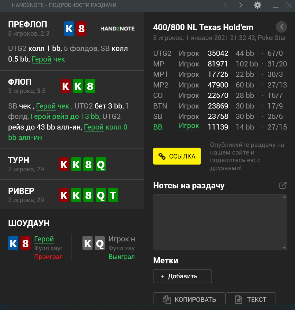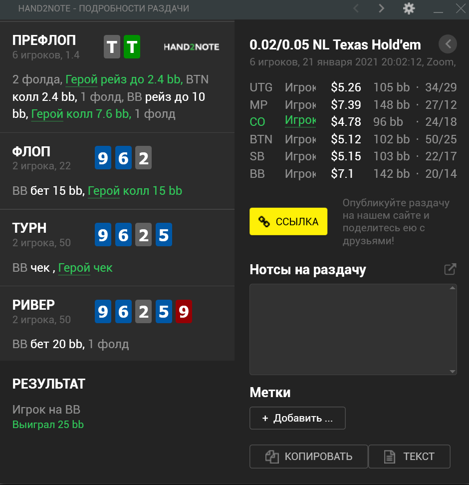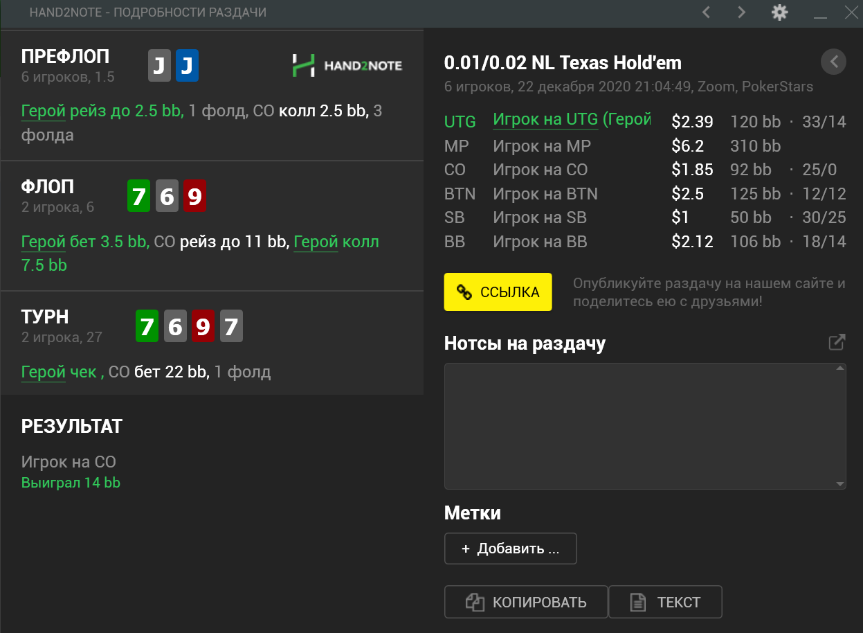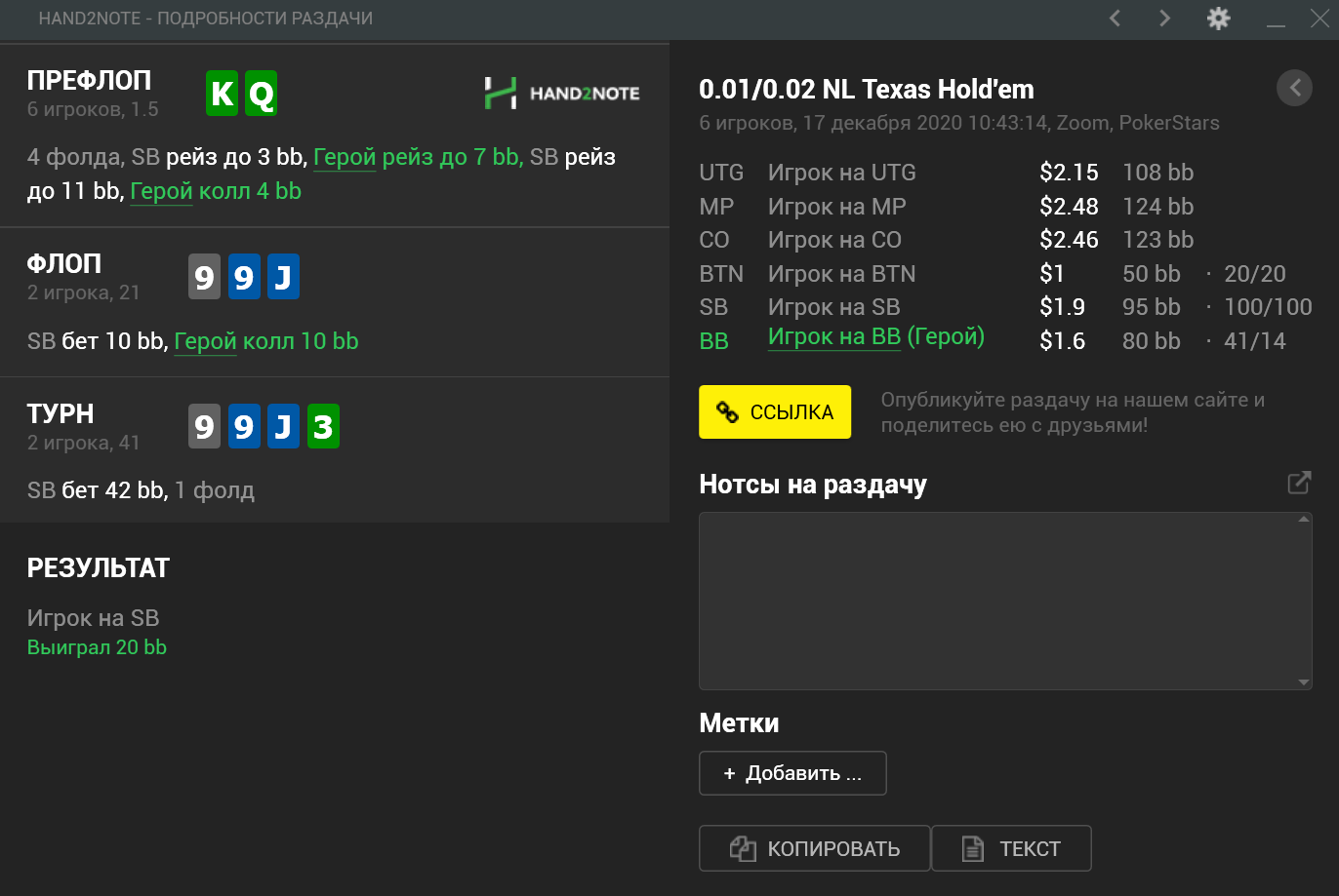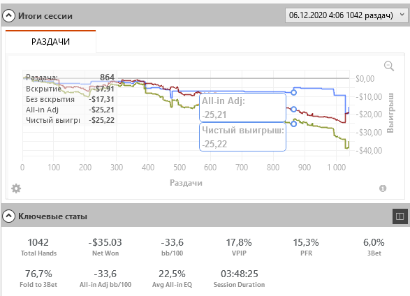 >>44894 Зайди в Сессии, выбери нужную сессию и отсортируй руки. Можешь отсортировать по времени с начала/конца сессии, по размеру самого большого выигранного/проигранного банка, даже по старшинству рук можешь отсортировать. Или во время игры открывай ту же вкладку Сессии и отмечай недавно сыгранную руку для дальнейшего разбора.