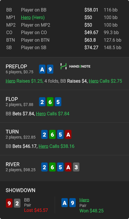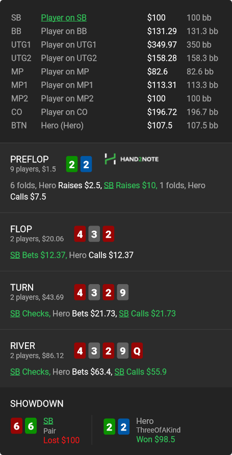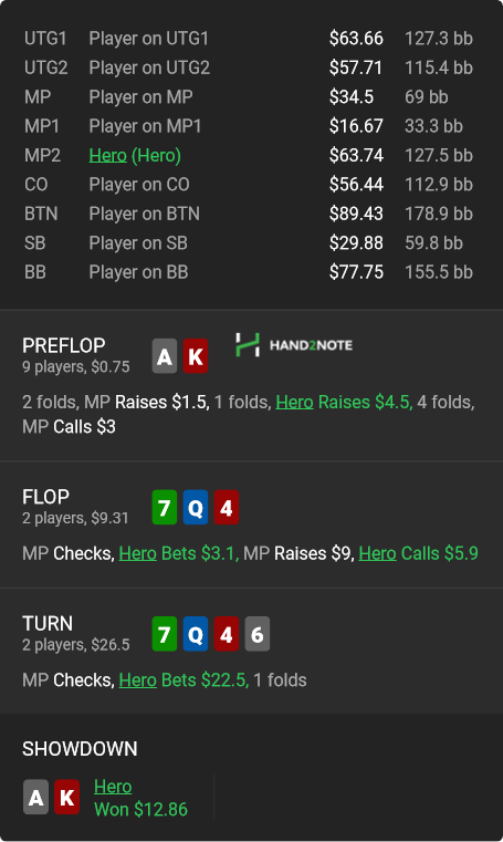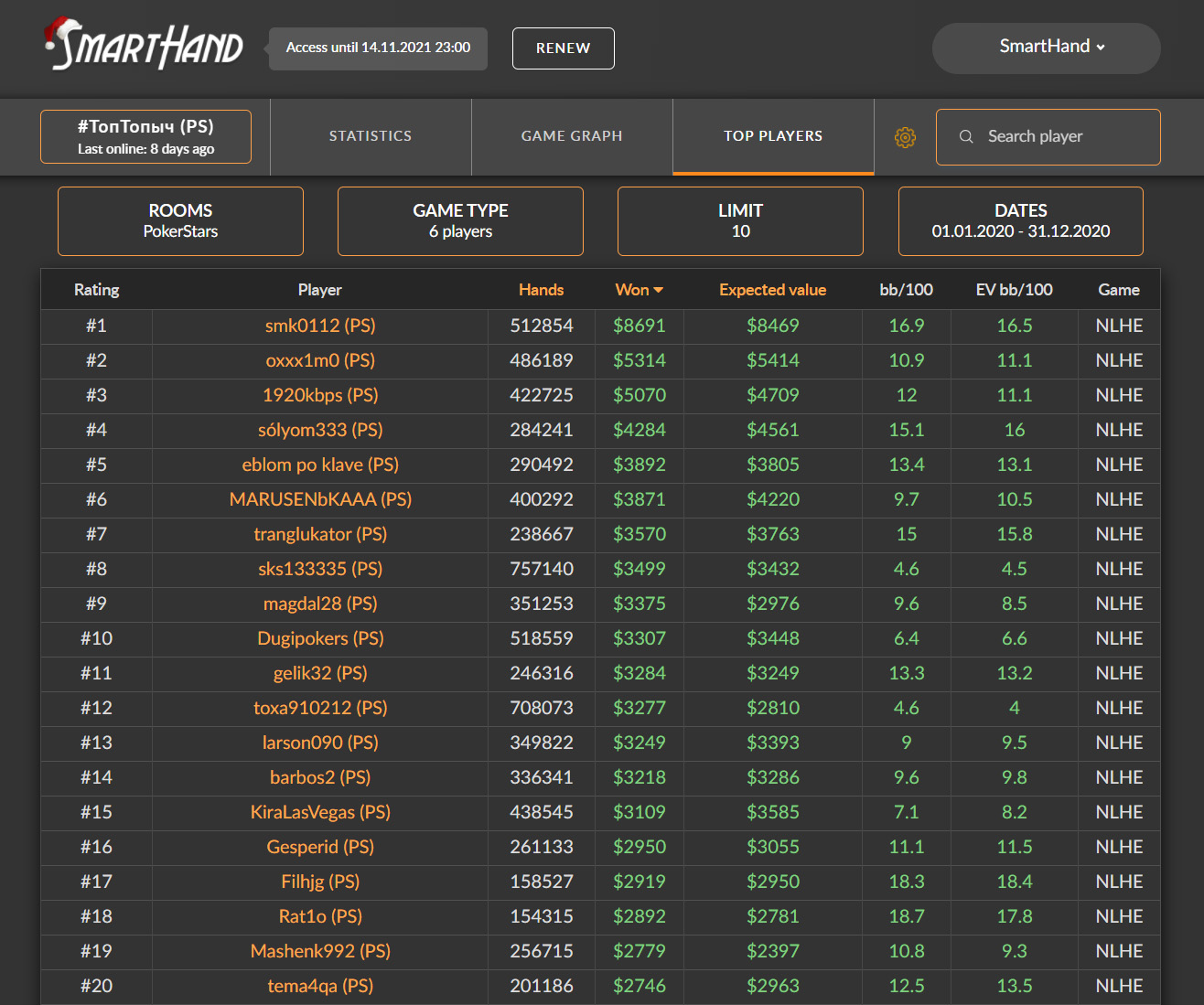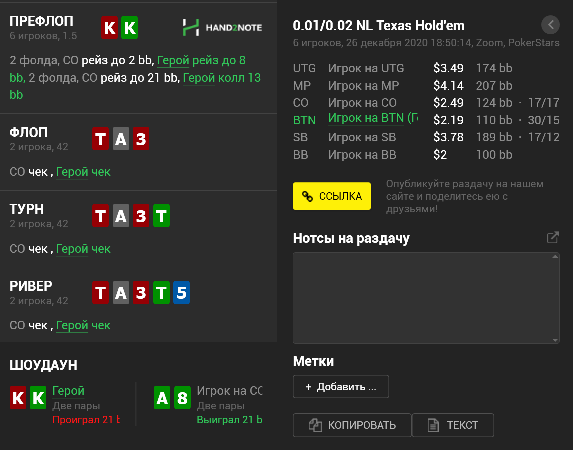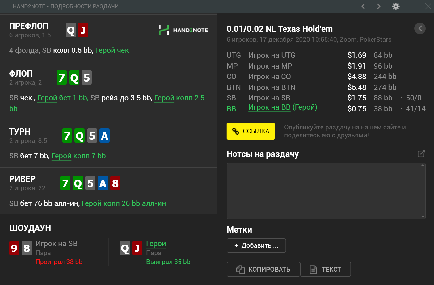>>44894 Зайди в Сессии, выбери нужную сессию и отсортируй руки. Можешь отсортировать по времени с начала/конца сессии, по размеру самого большого выигранного/проигранного банка, даже по старшинству рук можешь отсортировать. Или во время игры открывай ту же вкладку Сессии и отмечай недавно сыгранную руку для дальнейшего разбора.