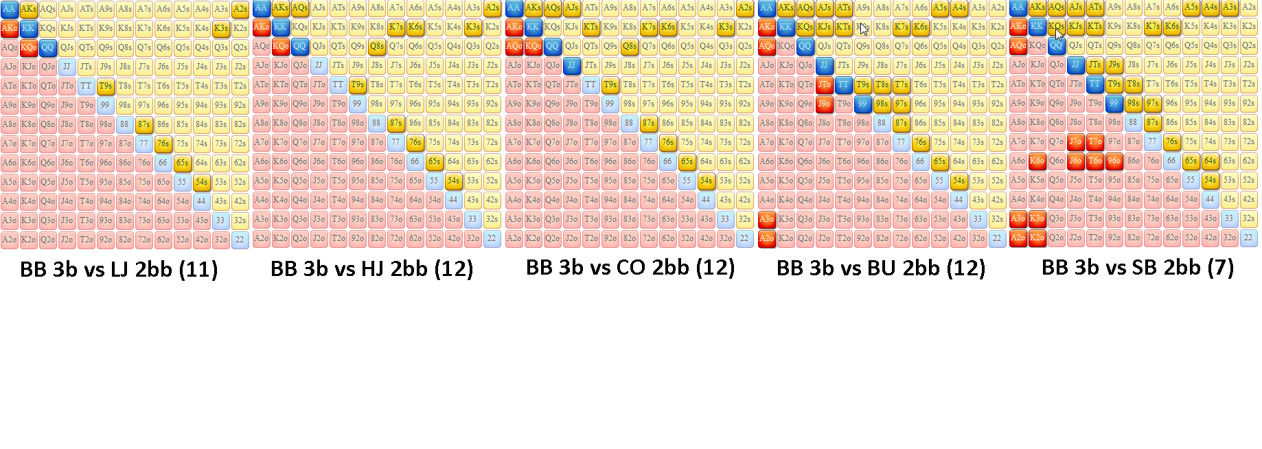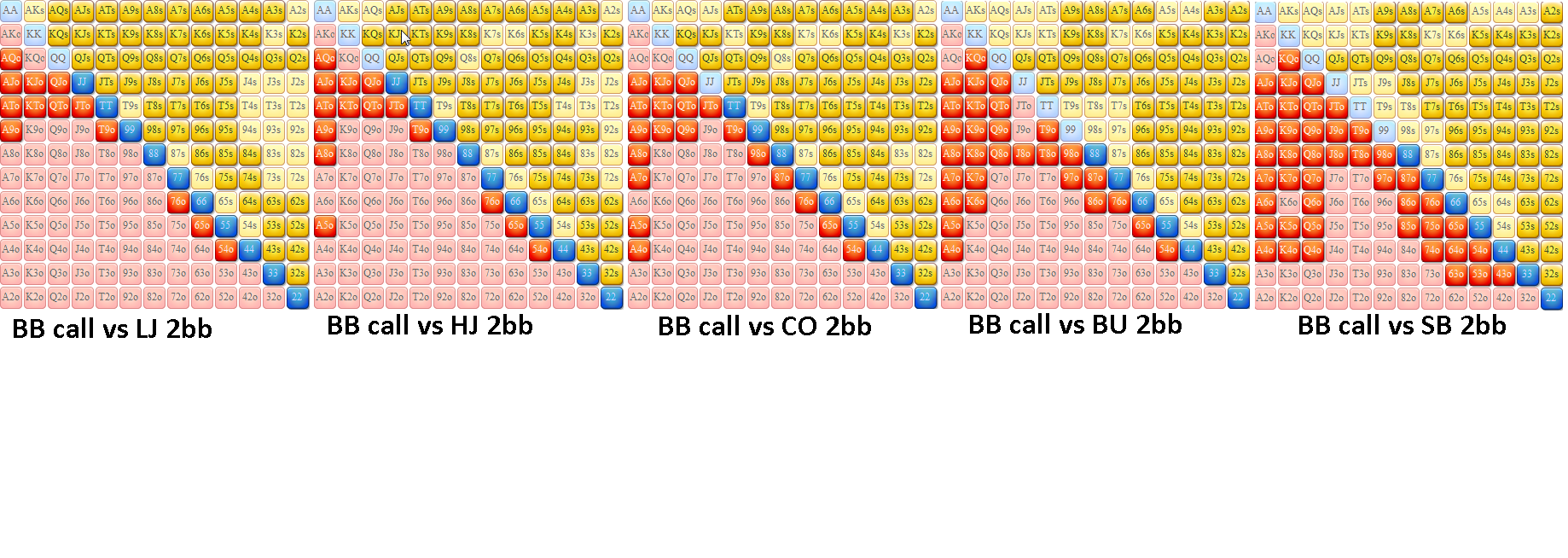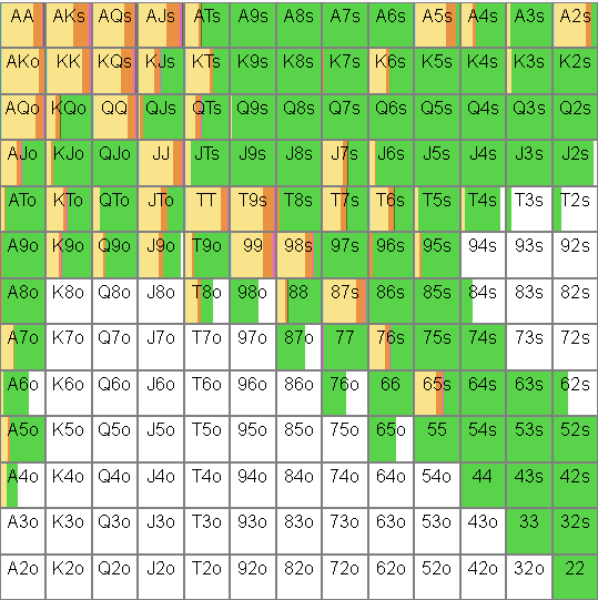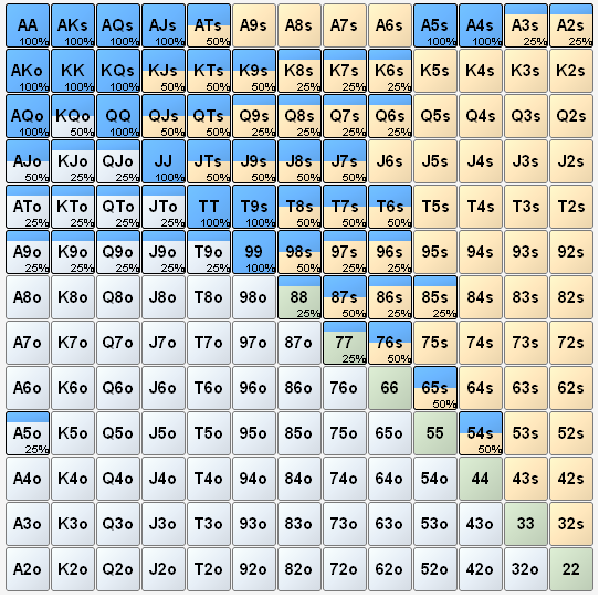 >>44877 20% OPR из UTG. 100% из MP. Колл 3бета в 20% случаев (из UTG 100%, но 22 фолдим). На SB можно 10-20% рестились. Колдколл только под фишей или защитой на стил на BB.