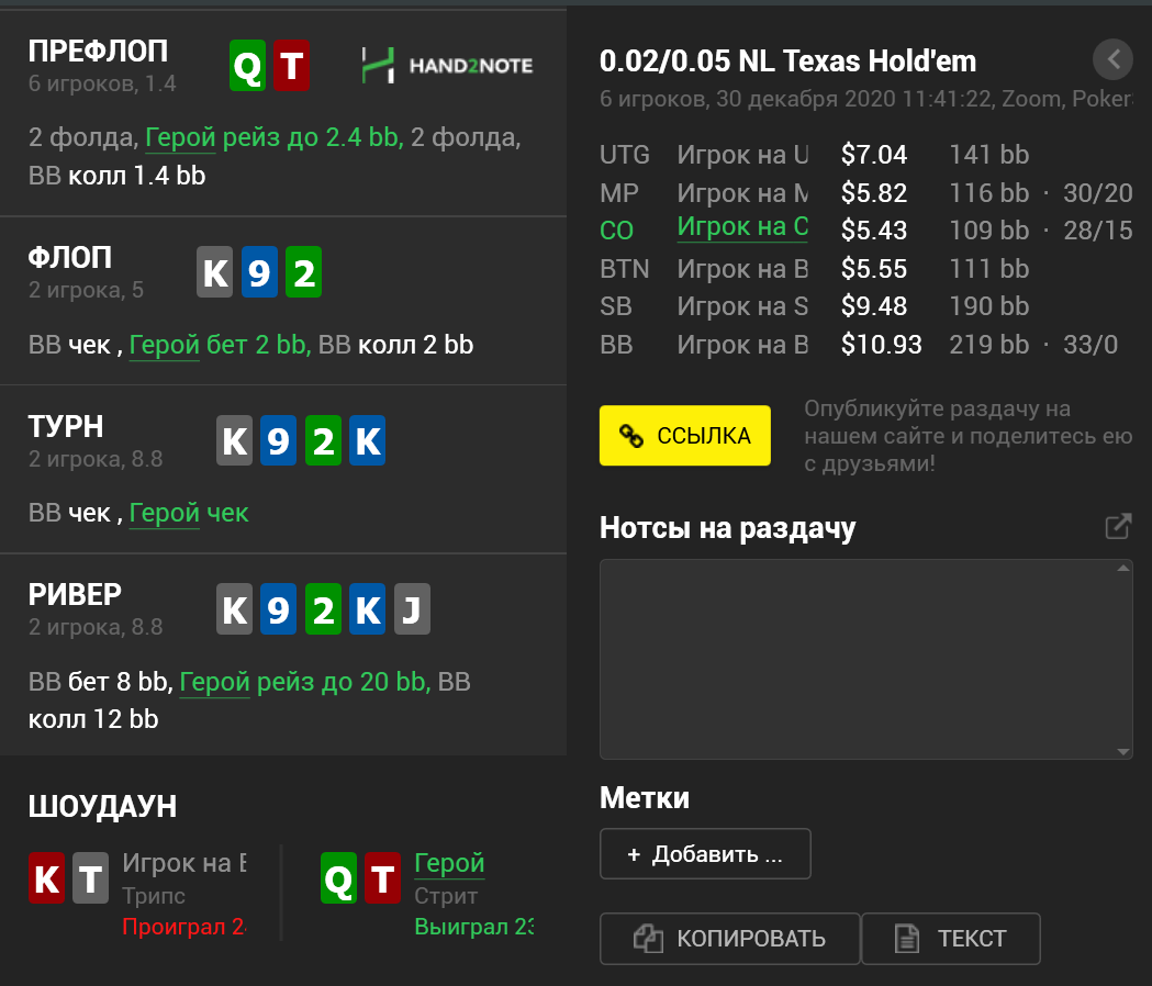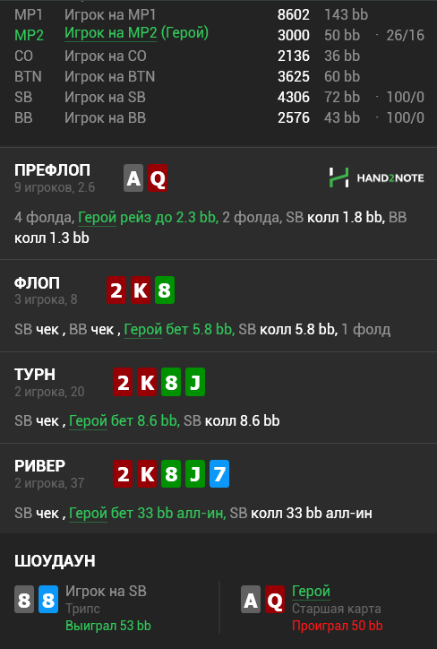 >>45049 Есть такое с неумением фолдить 2 пары. Всегда стэкаюсь даже на самом уебищном борде и заслуженно проигрываю. Но мое ссыкливость заключается не в этом. Вот допустим, у меня QJs на ББ в баунти турнире, CO фиш (30bb) минрейзит и BU(20bb) репушит и я фолжу свою руку, хотя даже если его рейндж репуша KJs+,ATo+ и 22+, то у меня неплохое эквити против них, но мне пиздец ссыкотно вылететь. И в лучшем случае, я получаю свой мин ИТМ и иду нахуй.