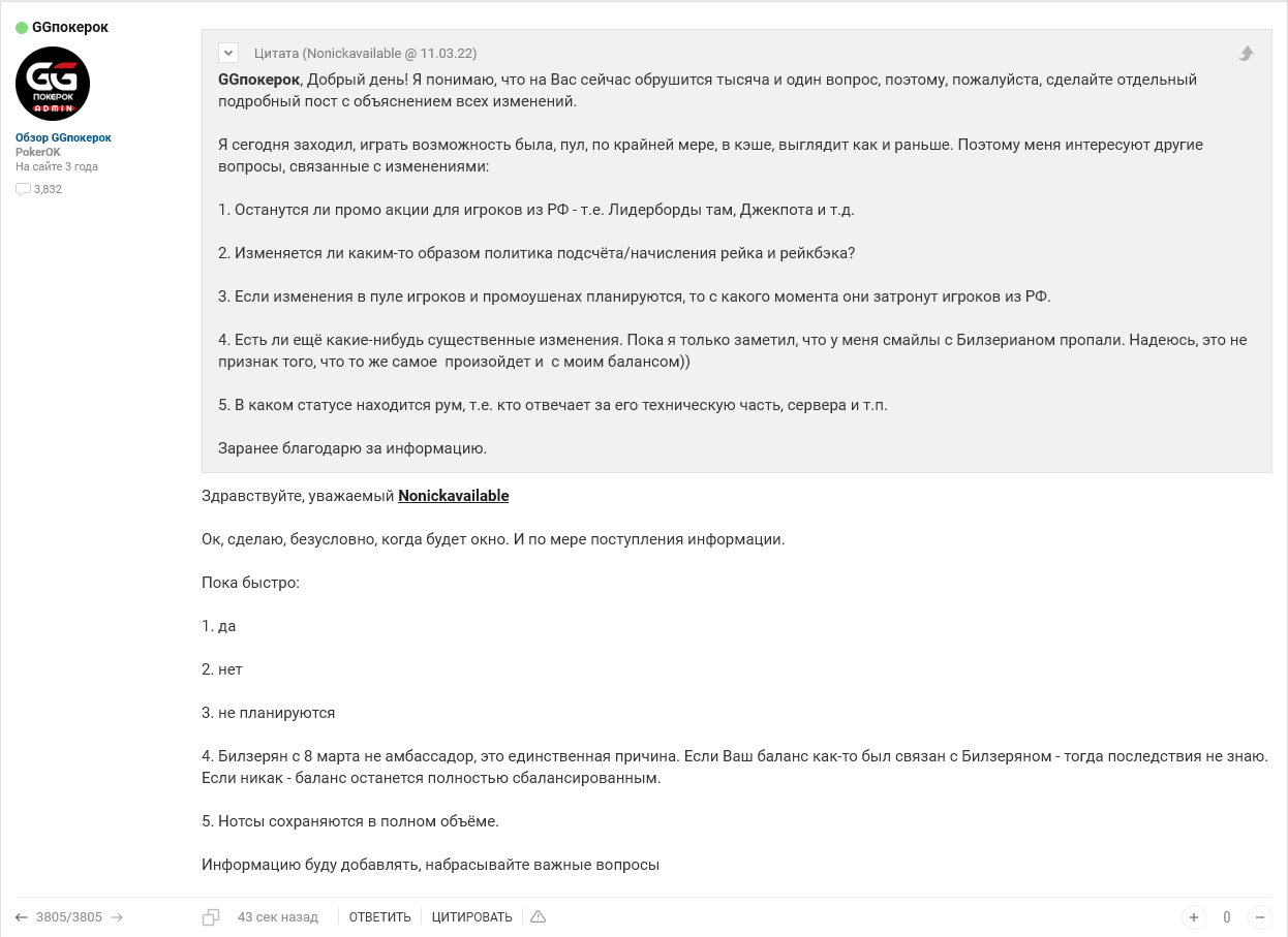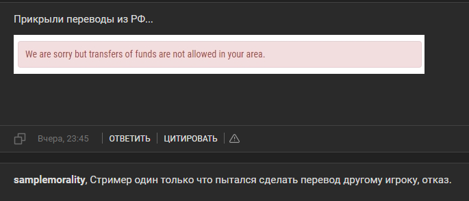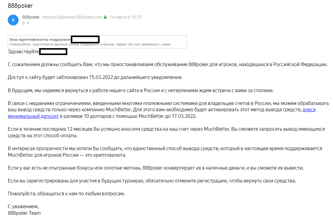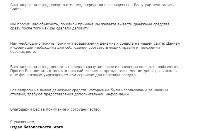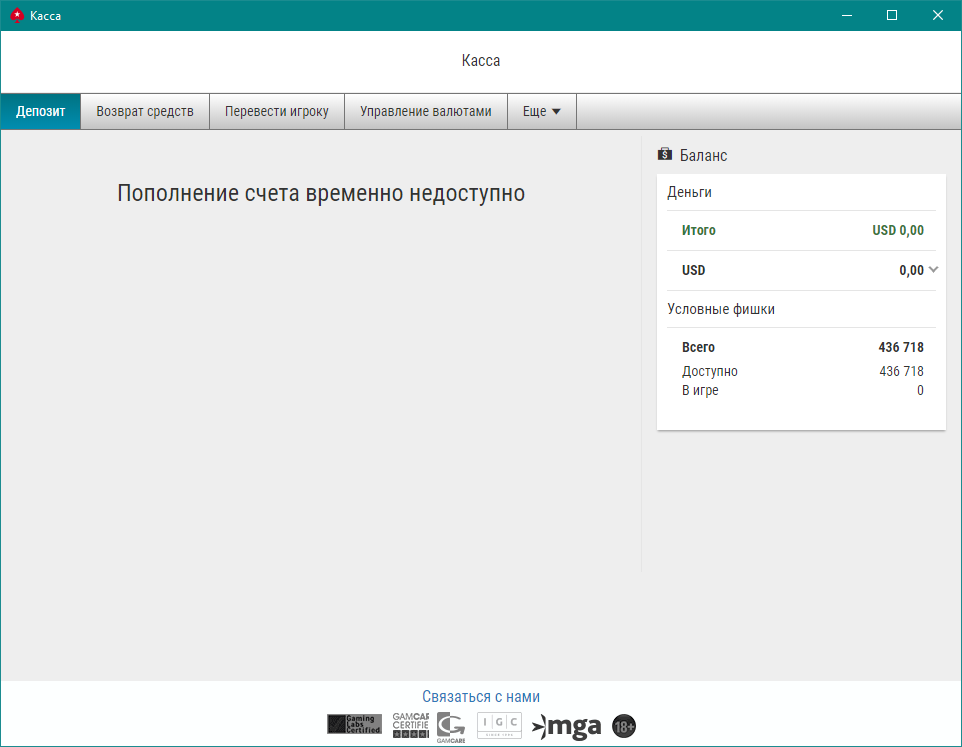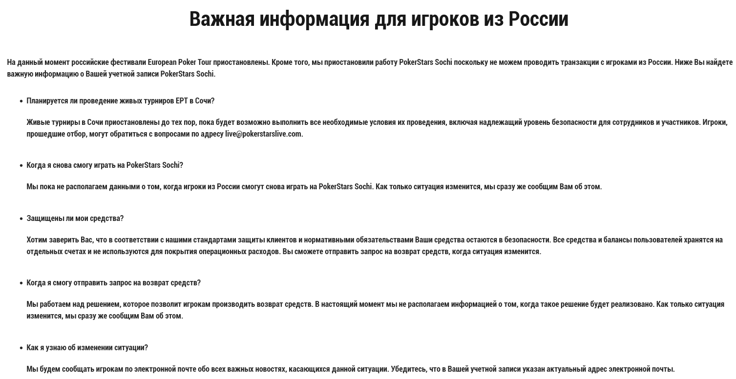 >>48823 Так чего проверять, там в кассе даже опция такая пропала, же. Вместо этого такой текст: Due to increasing restrictions, we are unable at present to offer most deposit and refund methods on PokerStars Sochi. If you previously used a deposit method which is currently not available, we are temporarily unable to process your refund. However, we would like to assure you that in line with our customer protection standards and regulatory obligations, your balances remain safe. All funds and balances are kept in segregated accounts and are never used for operational expenses. They remain ready to be refunded when the situation changes.