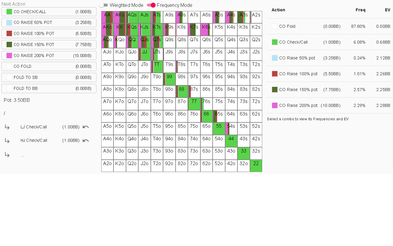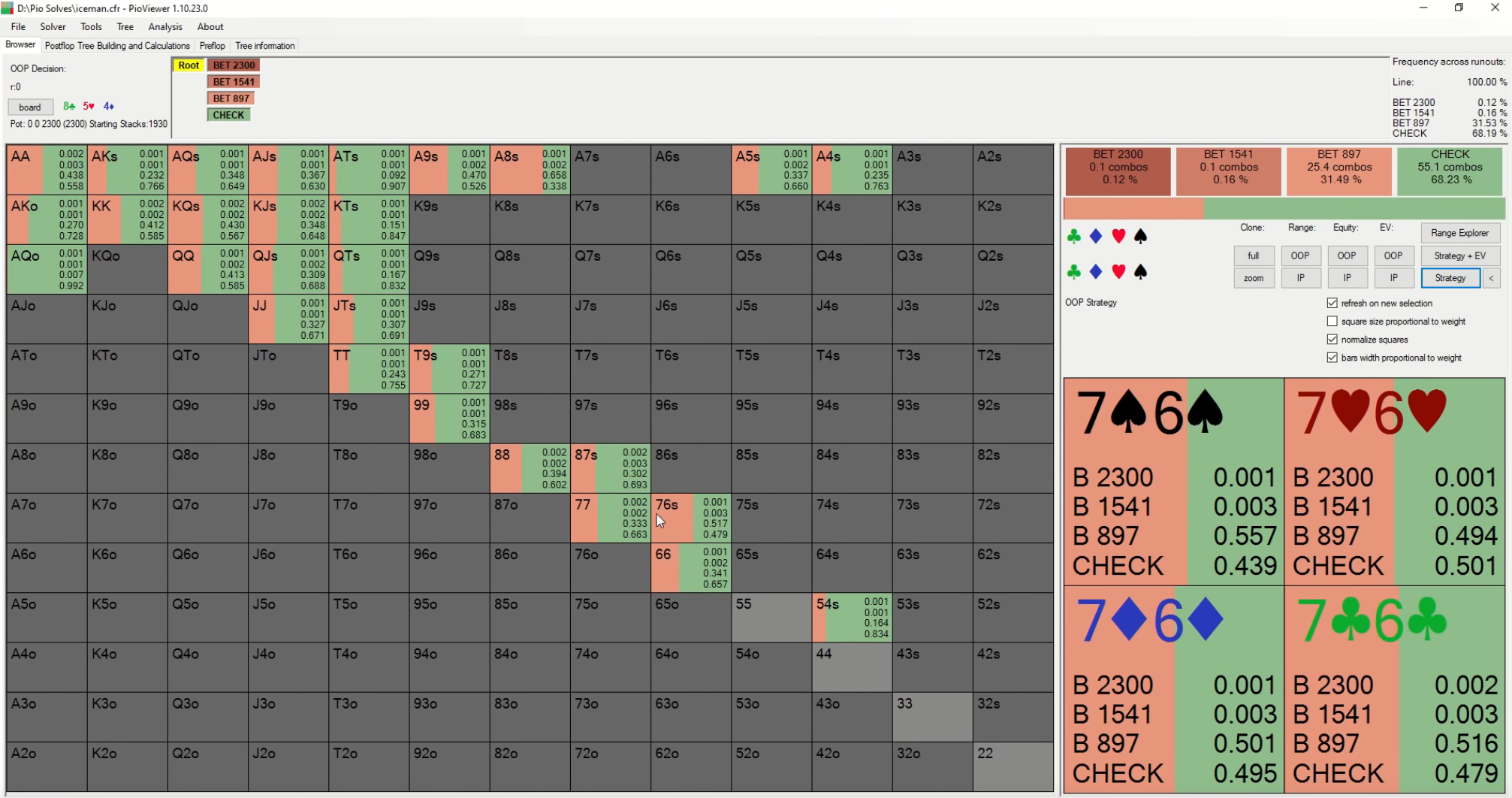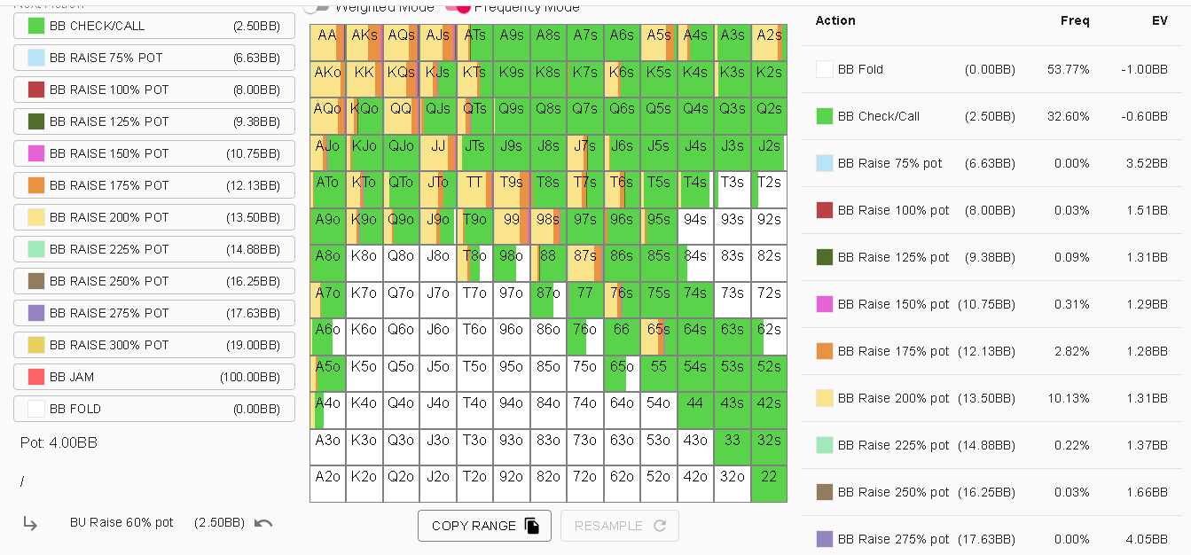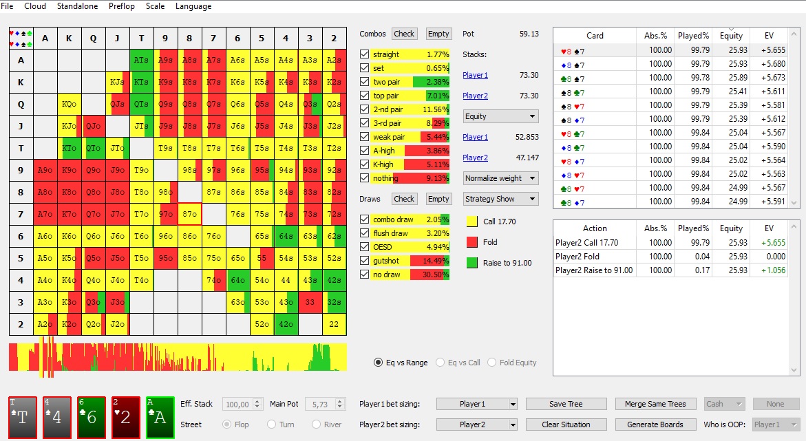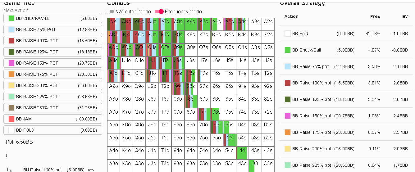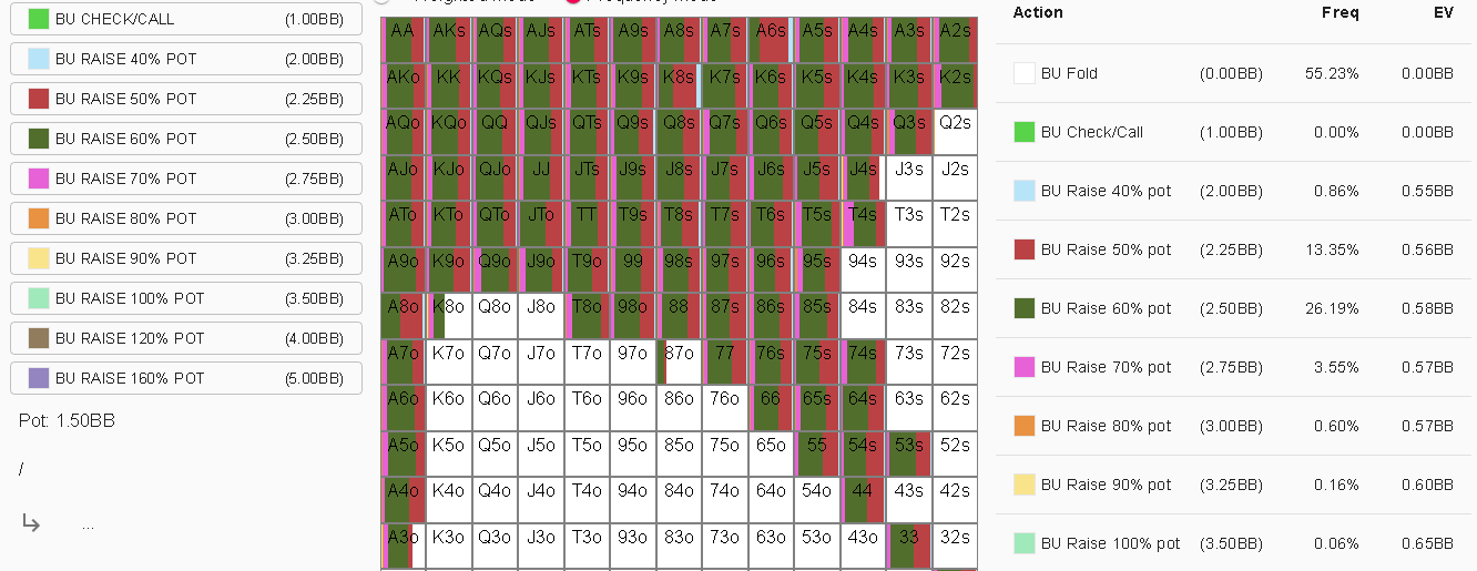 Есть тут у кого солвер? конечно же нет Так вот вопрос, будет ли он менять страту цбета и сайзов в зависимости от стеков и спр на флопе? Например на префлопе опен с баттона практически не меняется от 20 до 200 бб стеков, ну там пару % может быть.