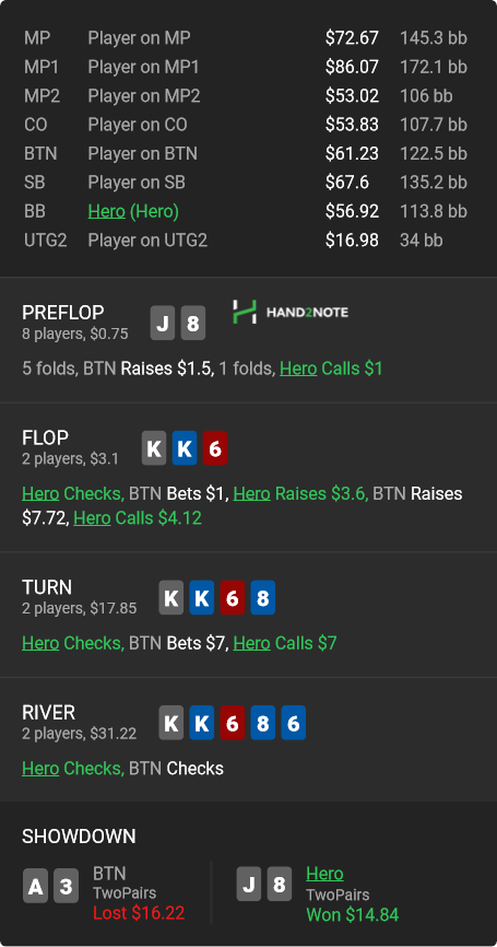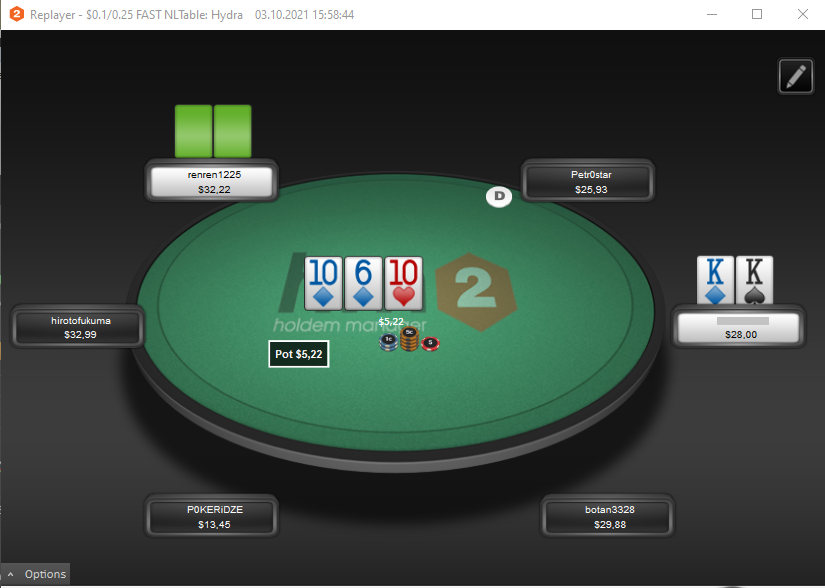 >>44873 > Говнокикер трипса Не ебу в префлопе ваших кешей, а откуда в 4бетпоте взяться лучшему кикеру к 6? У вас там A6s в 4бет уходят что ли? Те же вопросы по 88 и 22.