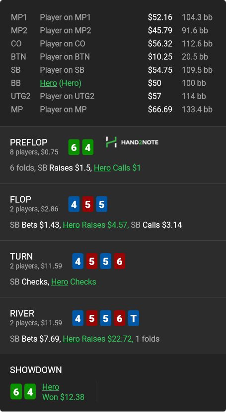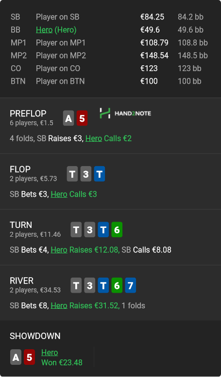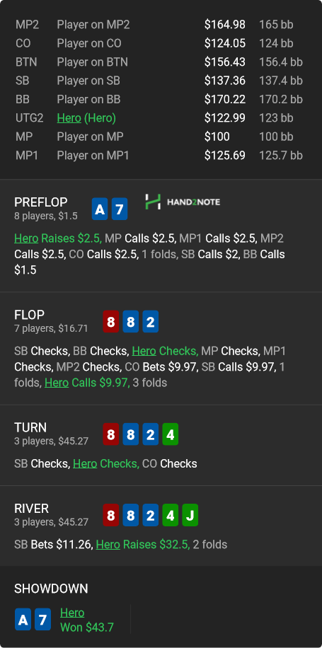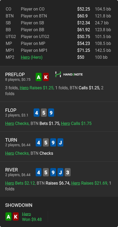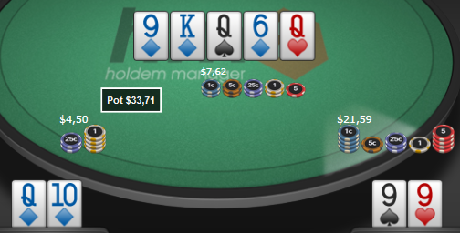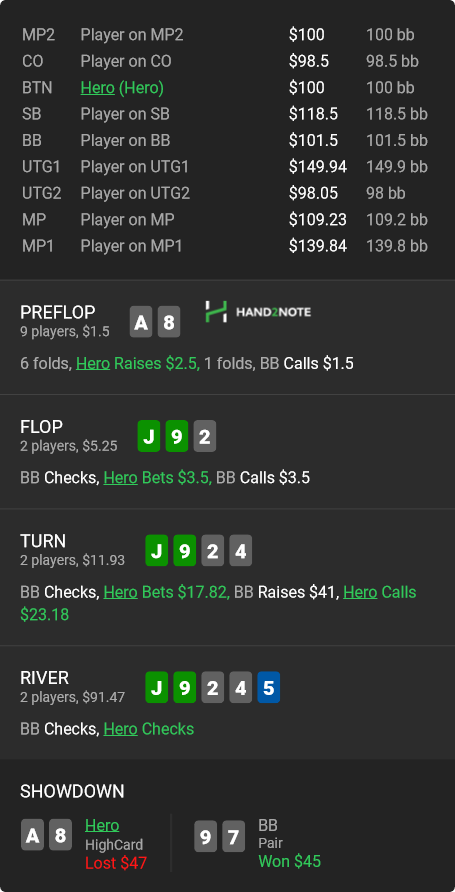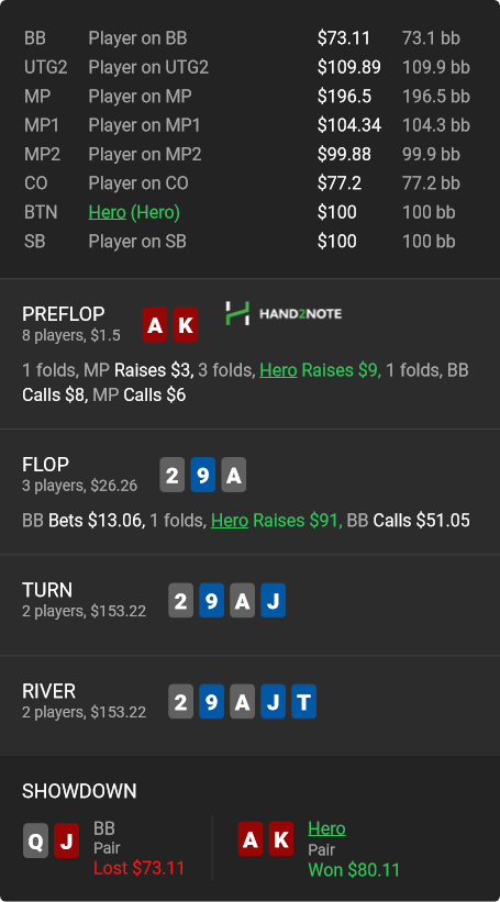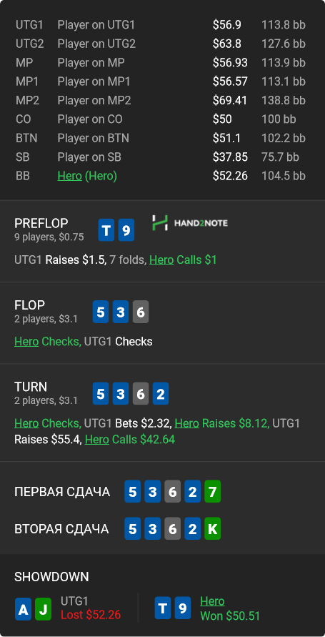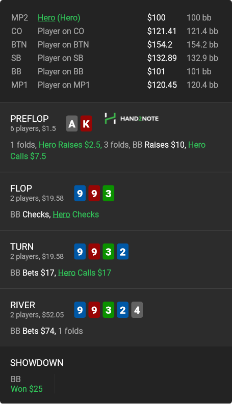 >>44663 Ниче сложного Выставил блок бет, получил неадекватный ререйз на такой доске, где добирать не с чего и нечем кроме натса, соответственно сделал вывод что ререйз блефовый, а значит его надо реблефовать.