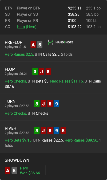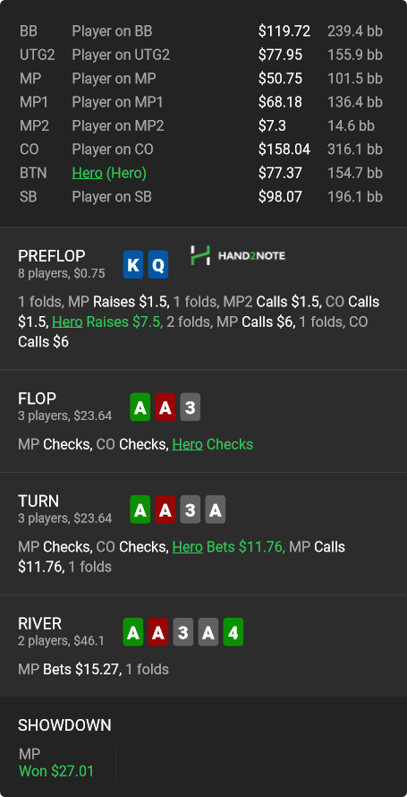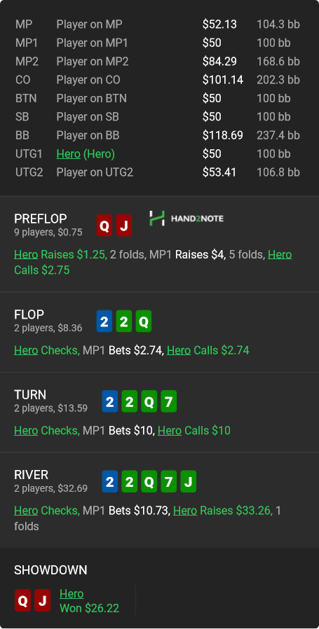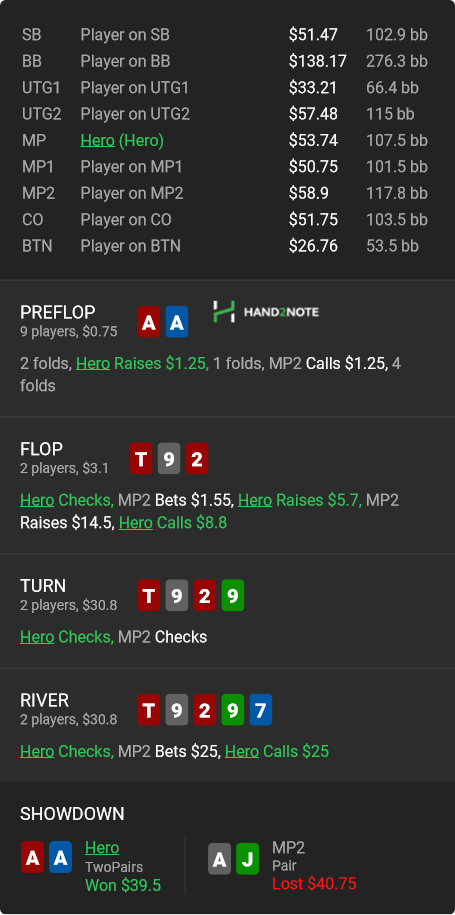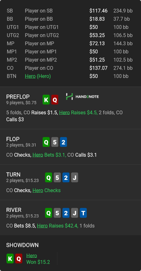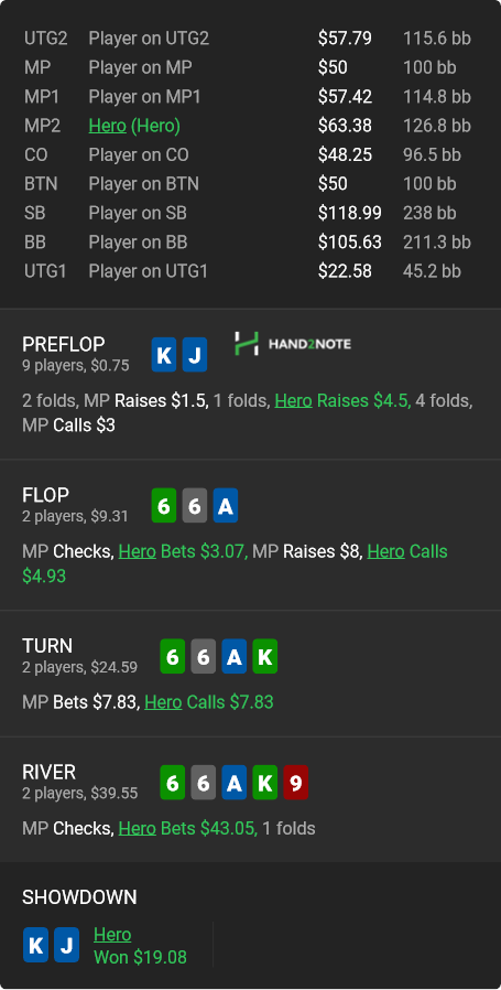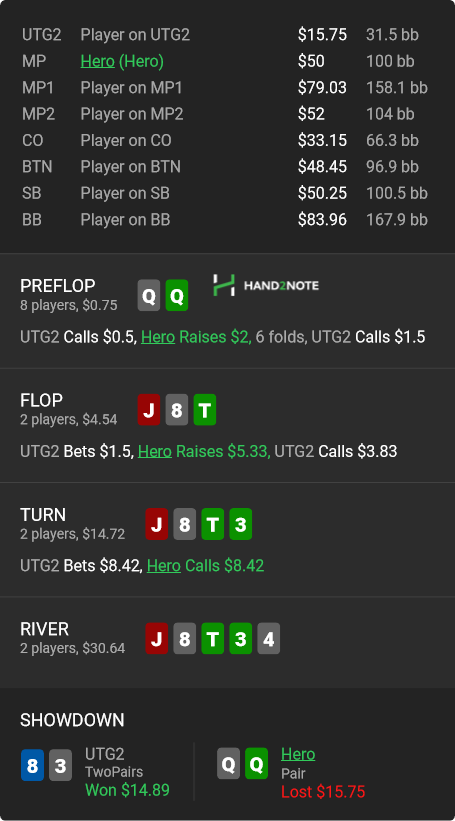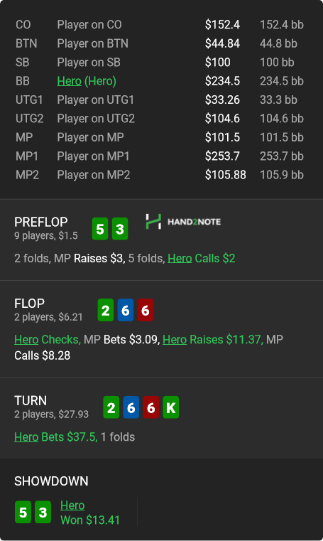 >>44663 Ниче сложного Выставил блок бет, получил неадекватный ререйз на такой доске, где добирать не с чего и нечем кроме натса, соответственно сделал вывод что ререйз блефовый, а значит его надо реблефовать.