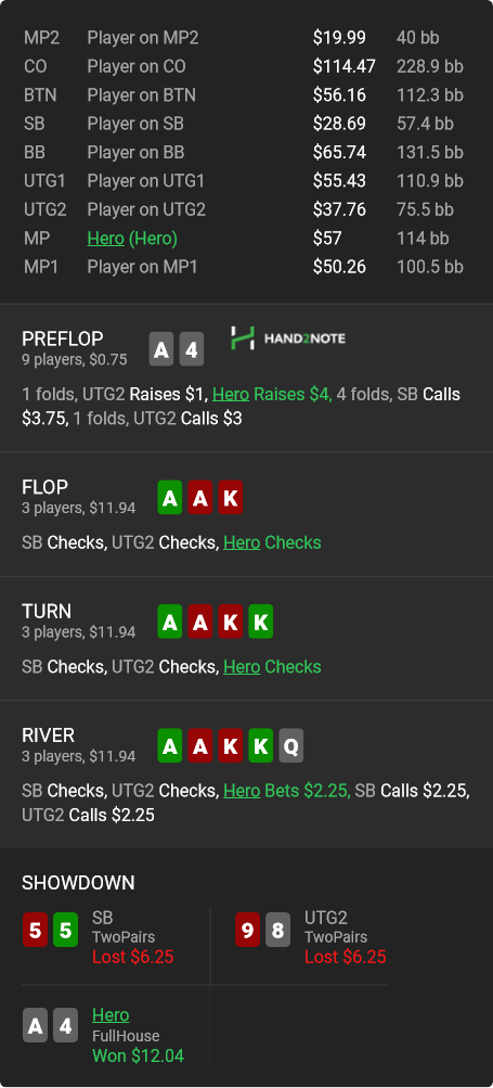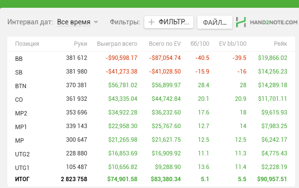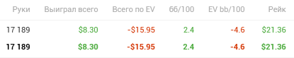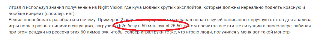 >>48991 Отбой. У меня стояла галочка "Не учитывать reg-vs-fish ситуации при построении стат". А т.к. у меня толком ни на кого стат нет, то кто фиш, а кто рег ещё не ясно и H2N выставляет всех по заданным параметрам и криво. Видимо это надо включать, когда уже приличное кол-во рук на поле набито.
