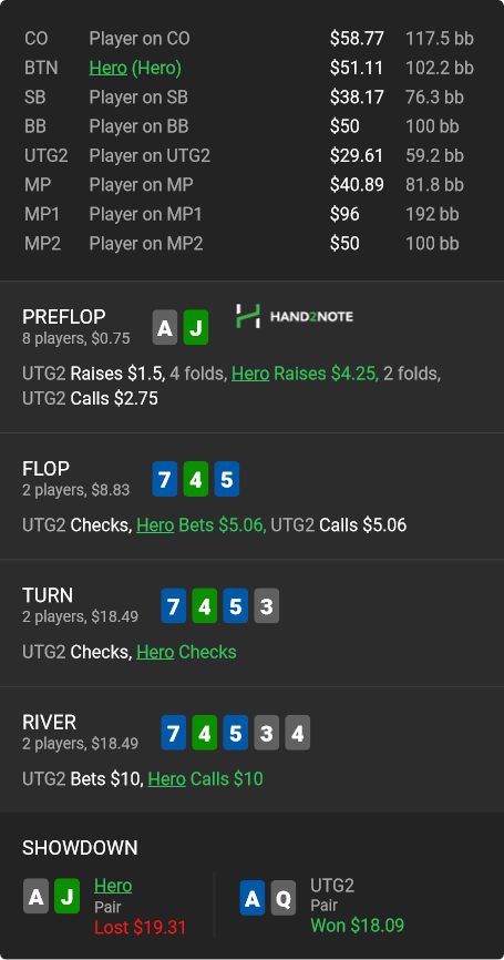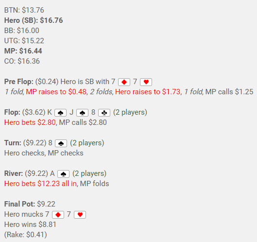 >>49111 Обычно пушат, если в банке лежит 20% твоего стека. Ради 10bb пушить не очень, да и такой пуш будет слишком узким, а мы хотим часто забирать банк. По идее надо делать оппам плохие шансы на колл, т.е.опен делать минимум 4bb, максимум 7bb (думаю 5,5bb самое то). И при этом расширять диапазоны, т.к. нам меньше ФЭ надо, чтобы забрать банк. Но и принимать пуш или 4бетить шире (если оппы подстраиваются).