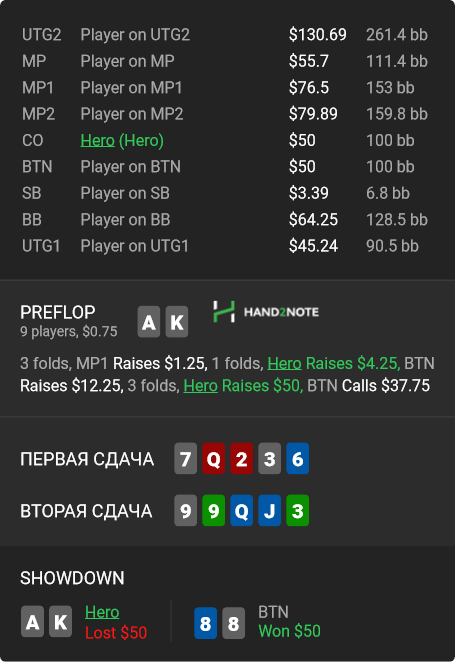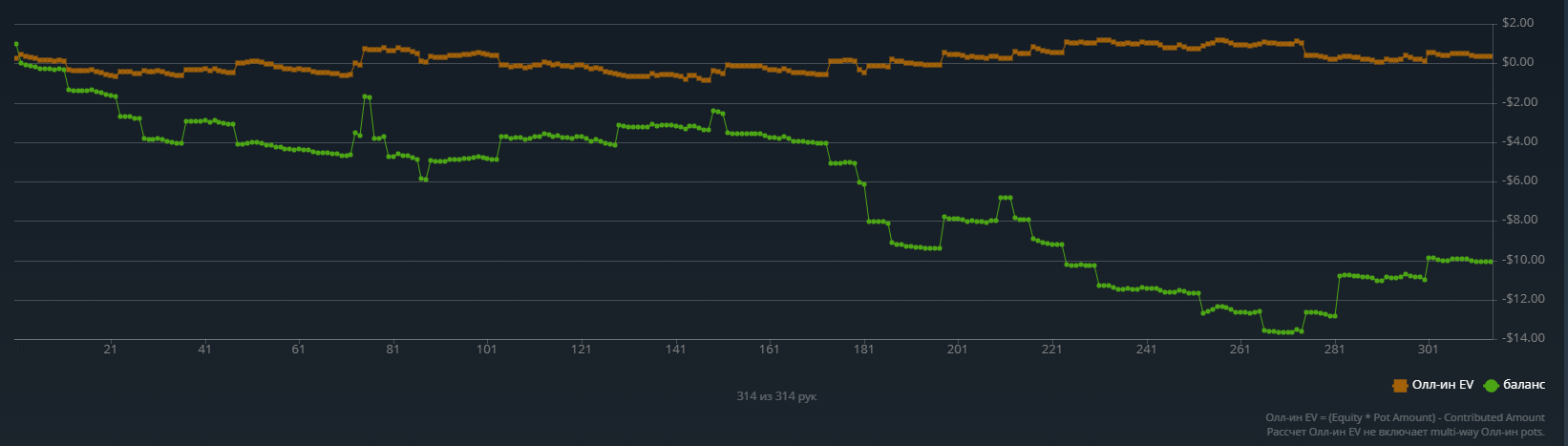 Забавная херня с этим мтт, сегодня смотрел финалку на старзовском канале, где там Лена Вия играли. И кароче споты странные, где допустим QQ открывает, получает пуш и жмёт колл. И там бля по всем айсмам и прочему говну нету кола, ты всегда будешь под доминацией, минимальная рука опа это AK против которой ты не всегда выиграешь. И кароче Лена это колит и выигрывает. Какой-то абсурд и такого там много. Последняя раздача была A4s vs AK где бля тоже понятно что ты с низким тузом будешь под доминацией, но он опять колит и ловит флше. Хотя по факту профитней уже с какими-нибудь 56 ставить 4беты. ставь лойс если понял про что я