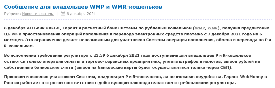 С webmoney сейчас ситуация непонятная. Ощущение, что PS решили балласт wmz слить. Я давно этой системой пользуюсь, в чатах у людей довольно панические настроения. Там у некоторых десятки тысяч накопления и не знают что делать, вывезти на бирже можно, но что wmz, что рубль в тыкву может превратиться. Все мерчанты отказываются от оплаты wm, я ни домен ни хостинг уже ими не могу заплатить, aliexpress недавно отключил, даже мобилку не пополнить.