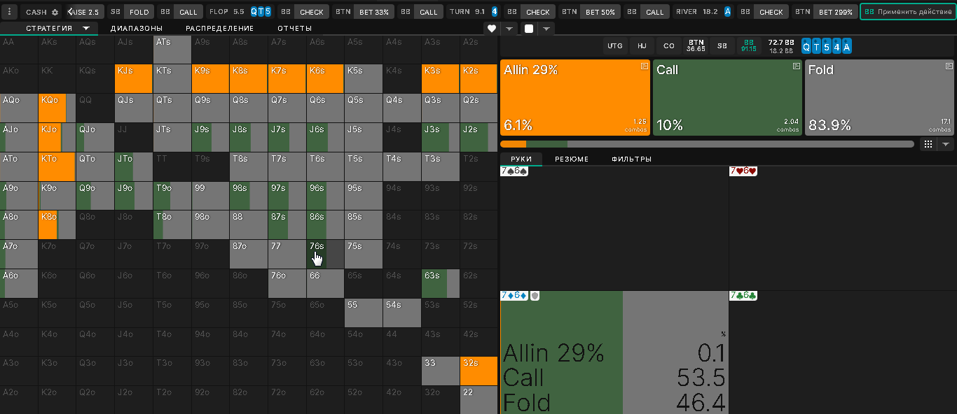 алгоритм 1 - Кол пуша снизу, цель сыграть как фиш и вколоть с ужасным эквити. Такая игра считается системой как фишная - значит её нужно подкручивать, чтобы и фанплееры выигрывали. Попробуйте сами сыграть в такие поддавки и вы увидите нереальные доски, когда вы с 27 будете выигрывать выставления против 4 игроков.