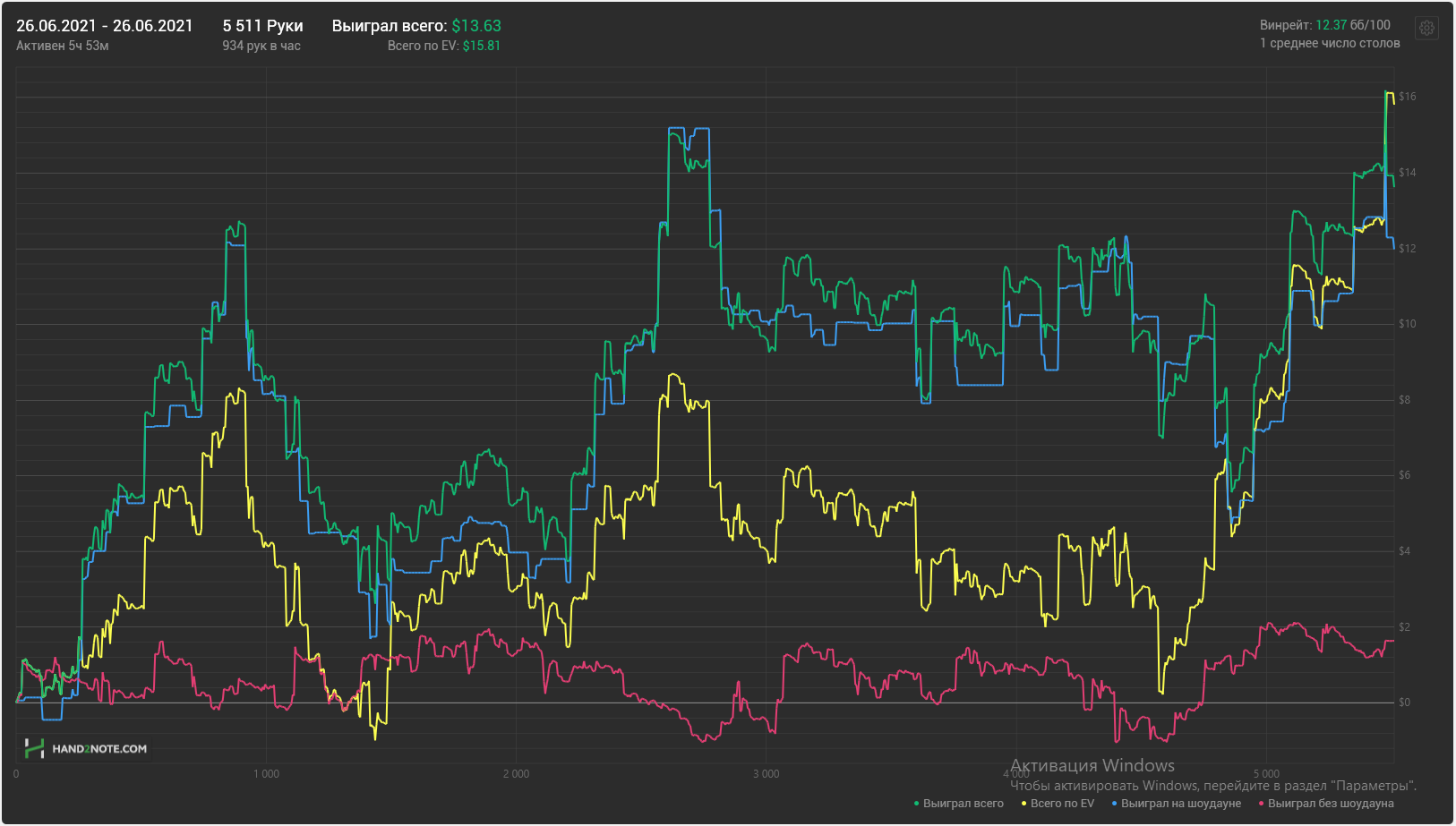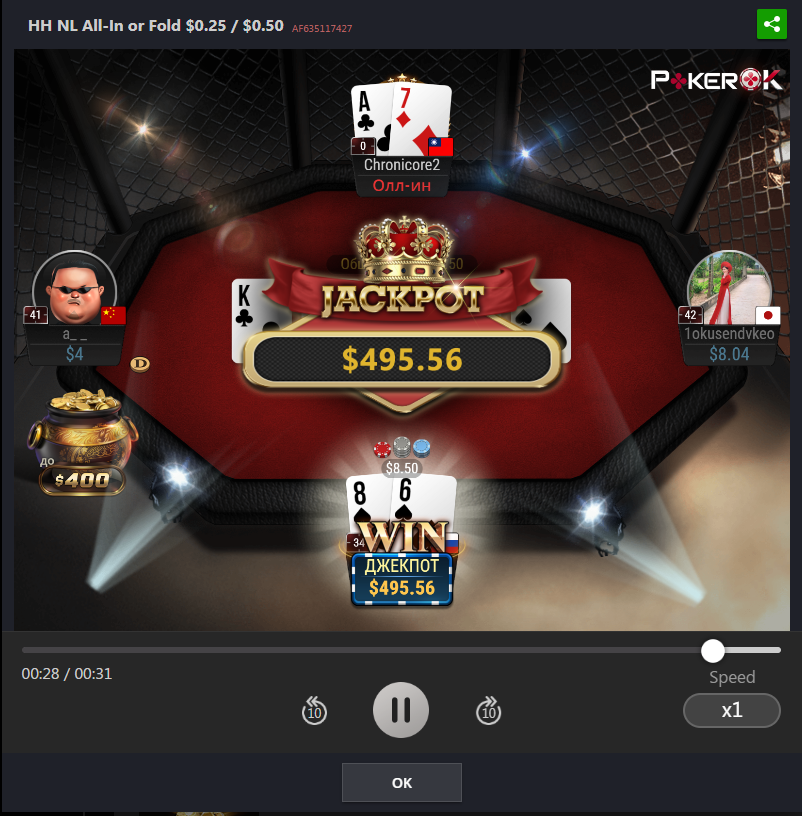 Играл all in or fold, как и планировал вчера - не стал соваться за столы утром и днем, а начал ближе к вечеру. Джек-пот на месте. К несчастью я чекал свой график в трекере во время раздачи и пропустил момент, а эмоциональная составляющая игры для меня тоже важна. Ведь это такая интрига - когда на столе лежит стрит-флеш-дро и с предвкушением и надеждой смотришь ранауты, а когда доездает - то ваще кайф. Тем более кайф, когда доезжает такая говённая рука, как Ахs, которая имеет всего 1 способ собрать комбинацию. Позже надо будет дистанцию доиграть.