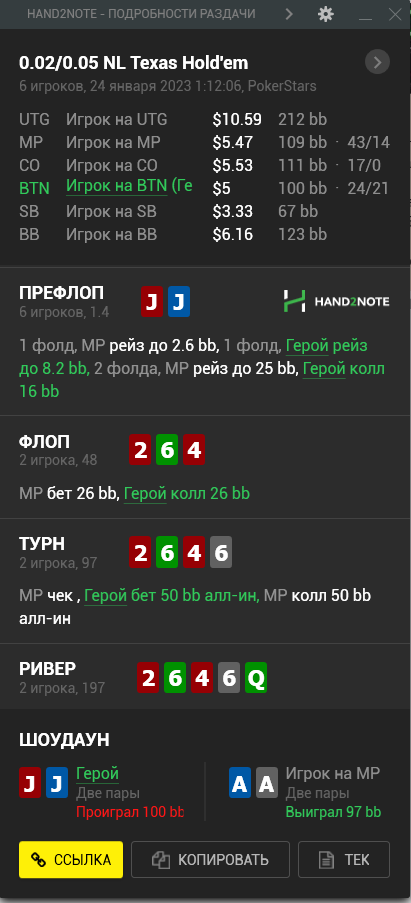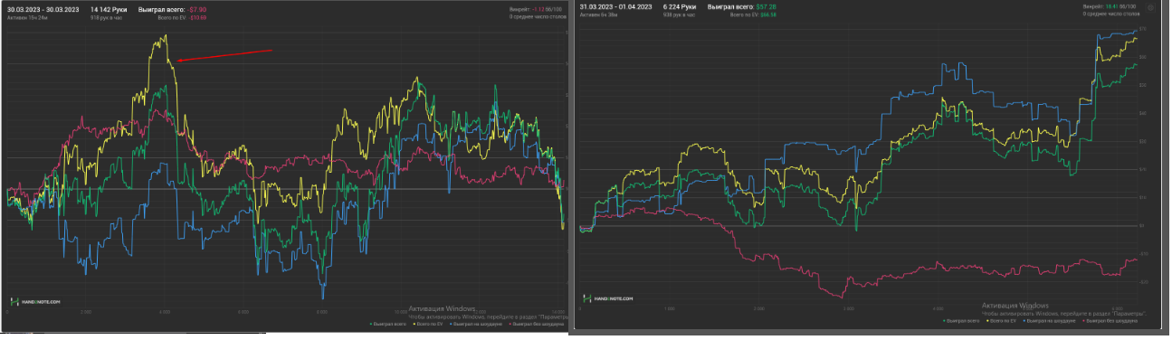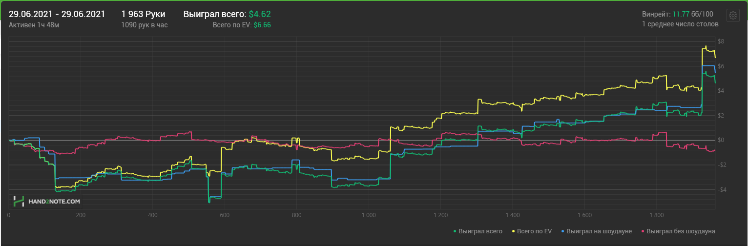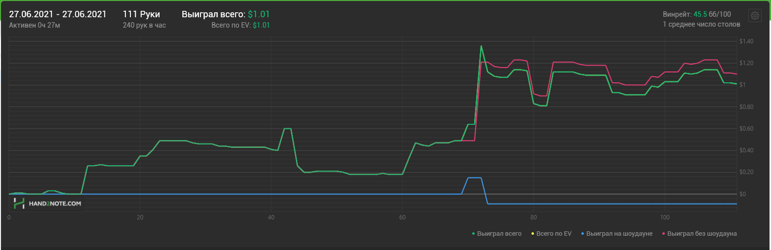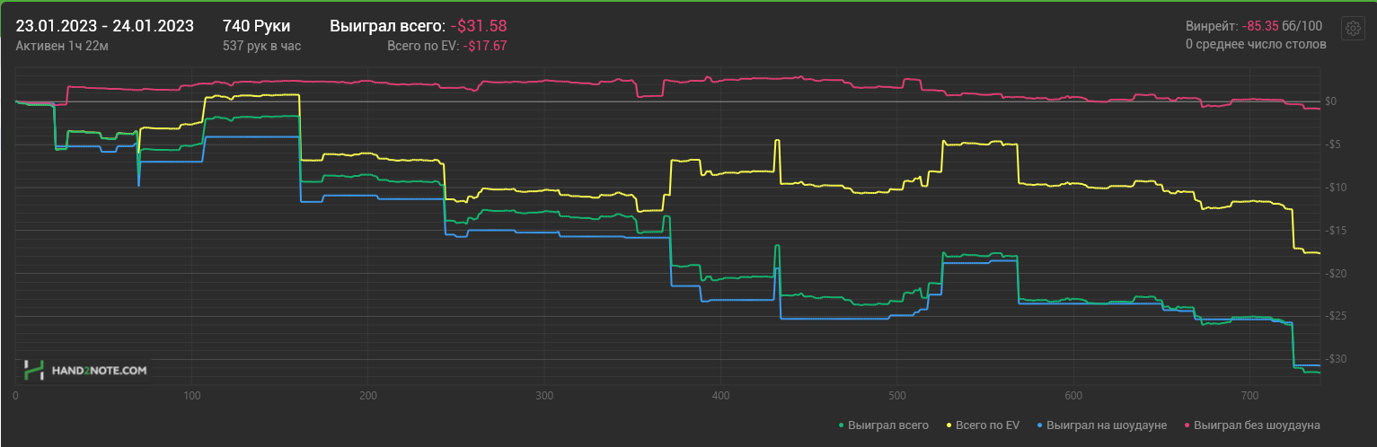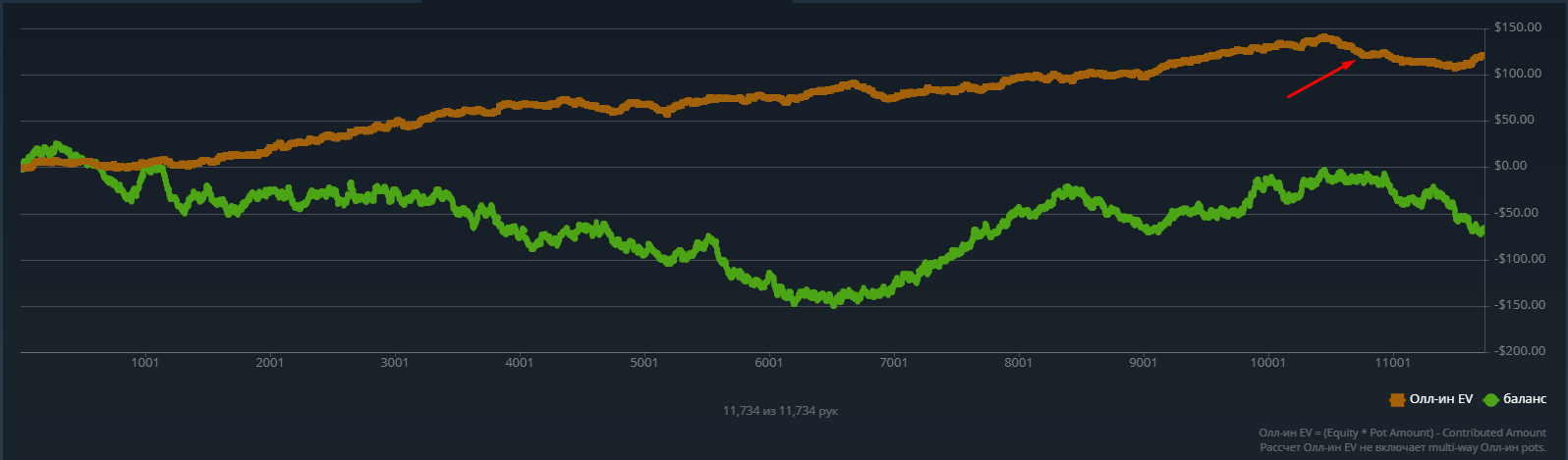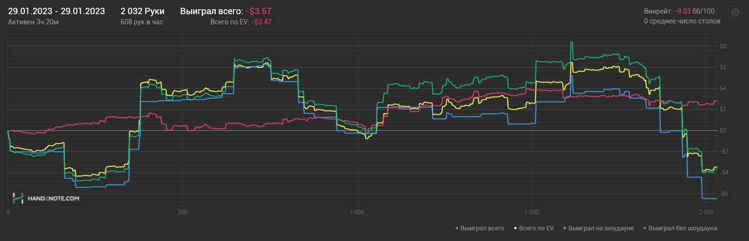 Доиграл кароче до талого - пока не поймал джек, но денёк всё равно в минусе из-за разрыва ev с реальным выигрышем. Плюс под конец аномальная хуйня, отметил стрелочкой, когда я с гавной по кд упирался в JJ+, а мои JJ+ вообще не проплачивались.