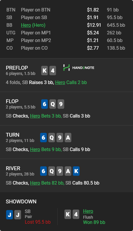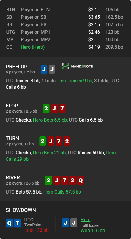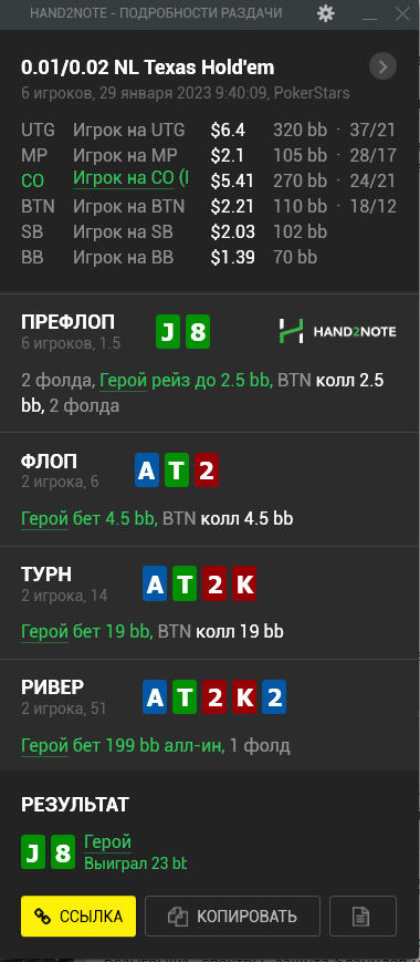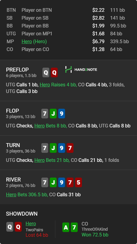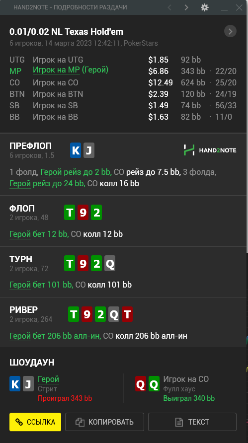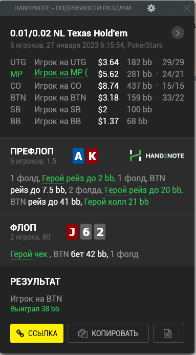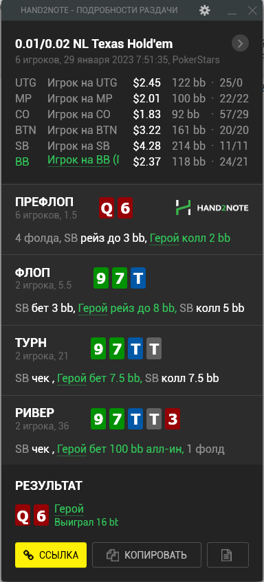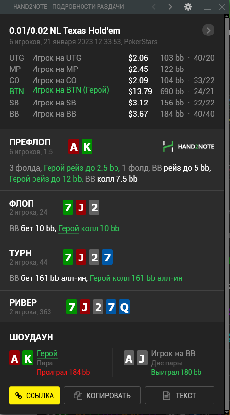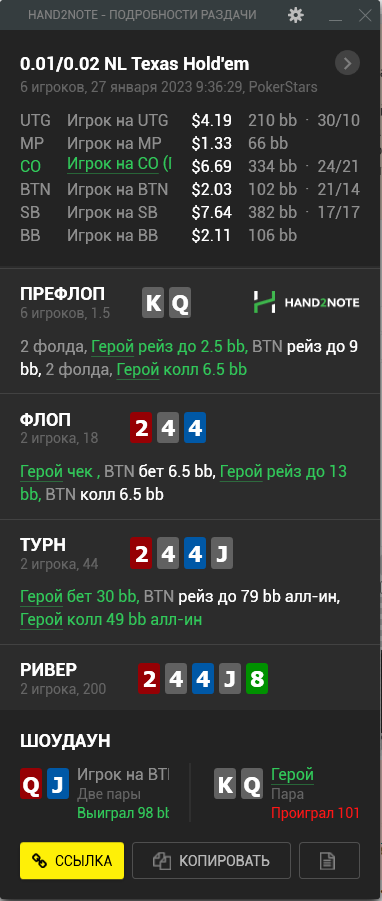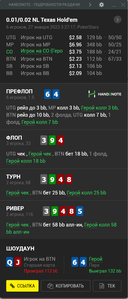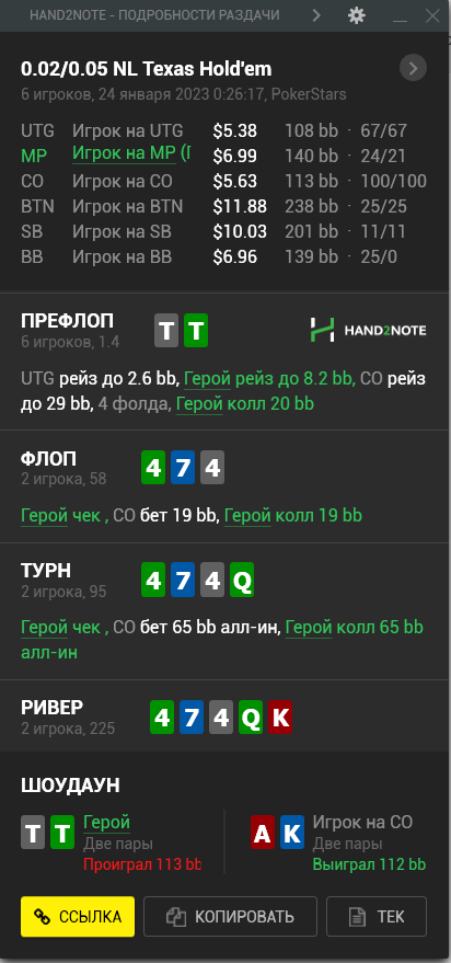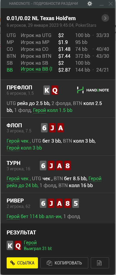 Доиграл кароче до талого - пока не поймал джек, но денёк всё равно в минусе из-за разрыва ev с реальным выигрышем. Плюс под конец аномальная хуйня, отметил стрелочкой, когда я с гавной по кд упирался в JJ+, а мои JJ+ вообще не проплачивались.