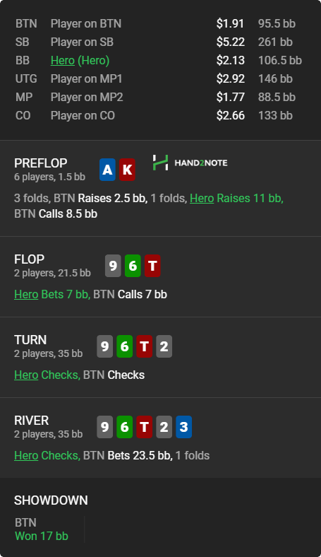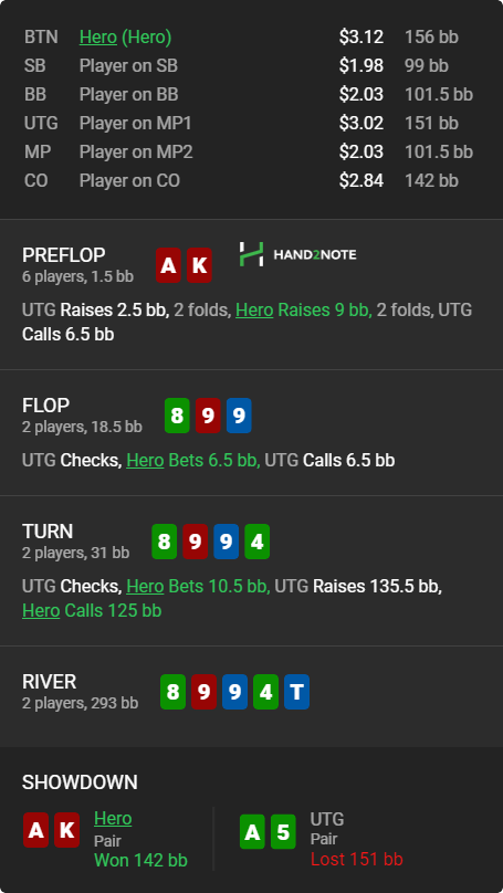Думал подвыбить оверкарты старше, но опп не зассал и познакомился с кнопкой колл, малаца. В зеркальной ситуации бы и сам не выкинул, пожалуй. К слову, о чеках с тузами >>50149, представь тут прочекаться а на ривере выиграть стек с нихуя у всех Ах