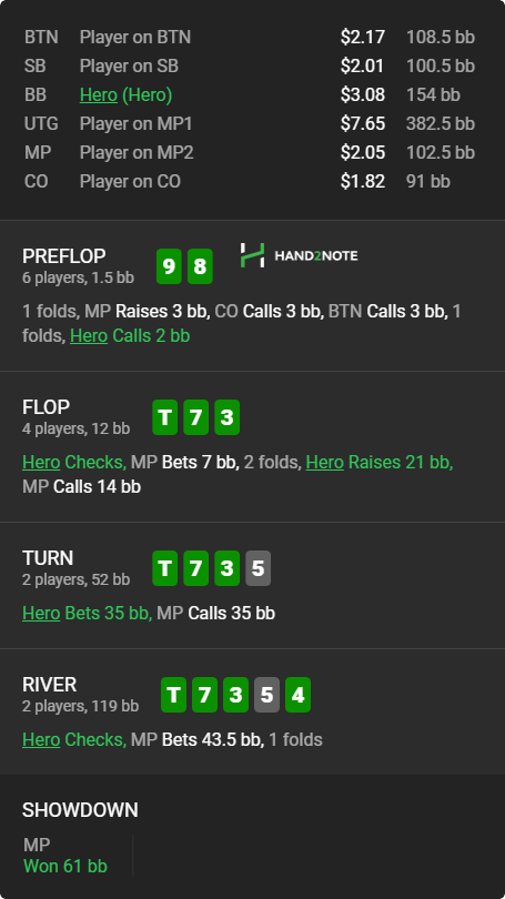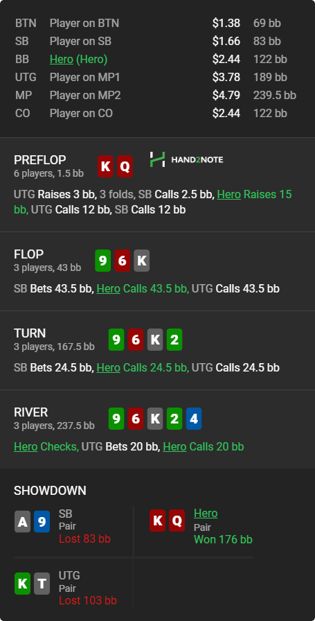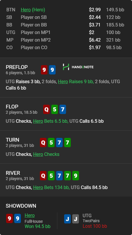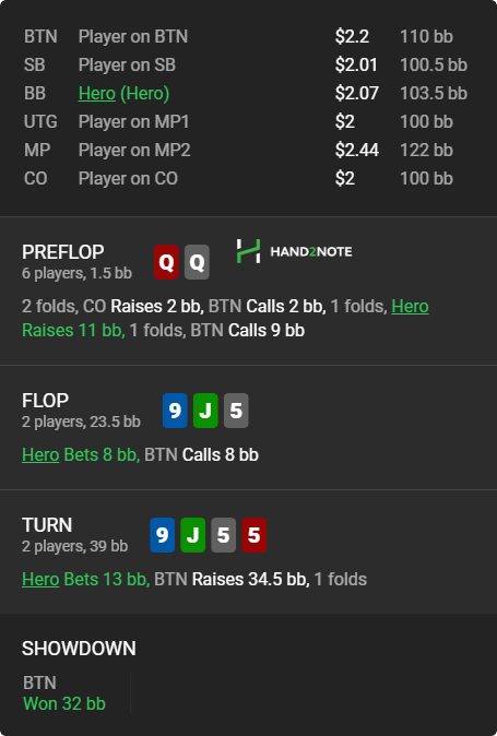 >>46863 1) Cмысла в колле пре особо нет. По ев пуш всегда будет выгоднее. 2) Ты немного перемудрил сам себя. На нл2 можно чуть поспокойнее относиться к рейнджам. Можно чуть более приземленными категориями размышлять, если у него здесь по твоему только велью руки, типа сеты или 5x, то можно спокойно выбрасывать, но это не очень частотная ситуация. Ему нет никакого смысла в позе рейзить фулл, а если он колит 3бет с 5x рукой, то ну что поделать, потом отыграешь. 3) Как-то очень коряво исполнено. 2s немного усилила опа конечно, но какие велью руки мы ставим флоп и чекаем такой терн? Тем более флоп сыграли маленькой. Типа ты просто заявляешь оппу своими действиями: у меня АК или AQ. Я бы в такую линию на месте опа весь диапазон бы ставил на ривере в эксплойт.