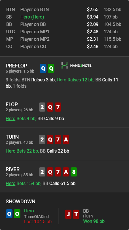 Во второй - не уверен что в низкую спарку у оппа тут есть ренжбет треть банка - а значит могу выебать его рейзами. План прост - получаем дохуя ФЭ на флопе, на терне в любую пику или Q, K пушу и снова получаю чутка ФЭ, а против колла хоть какое-то эквити. Но нет, далбаеб вколлил даже QJo, откуда у него эта рука вообще в 3бете, а даже если и есть то это явно низ ренжа и какого хуя он это не выкидывает на рейз?