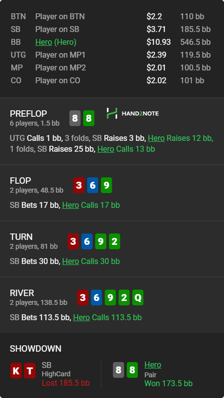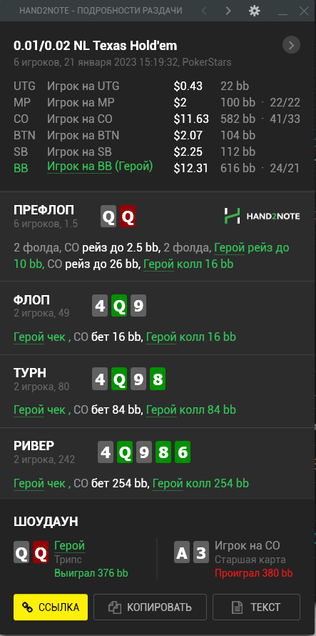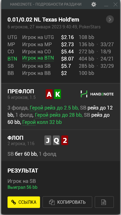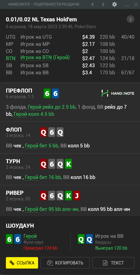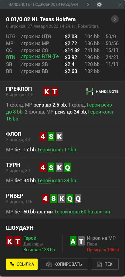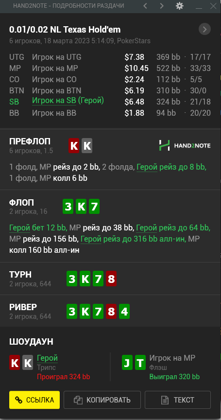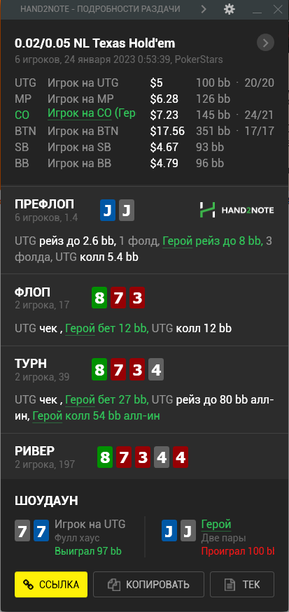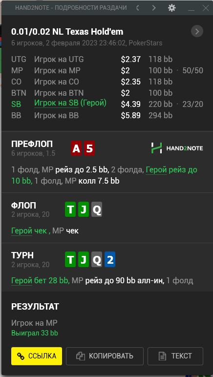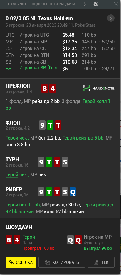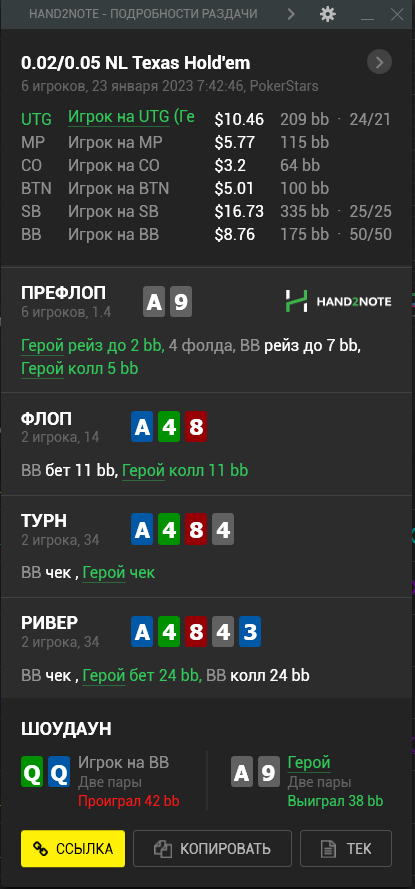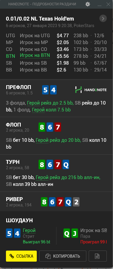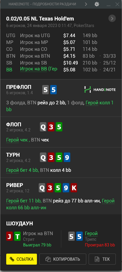 Пересмотрел ша раздачу и охуел что недобрал 4бб, походу мисскликнул и нажал треть пота вместо полпота, итого когда доехало - недобрал, недоехало - лишние 10бб въебал >>50085, пиздец короче, теряю винрейт за просто так.