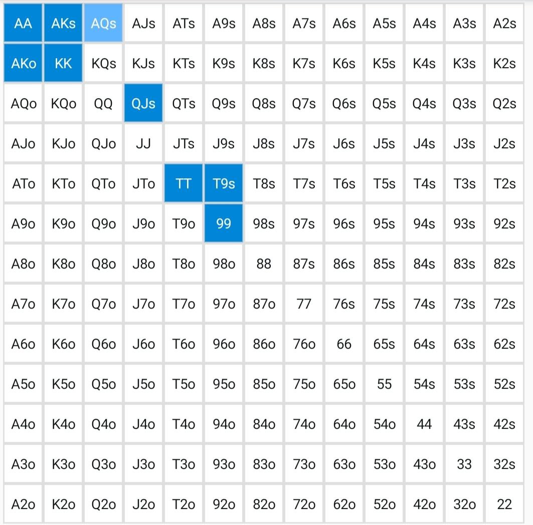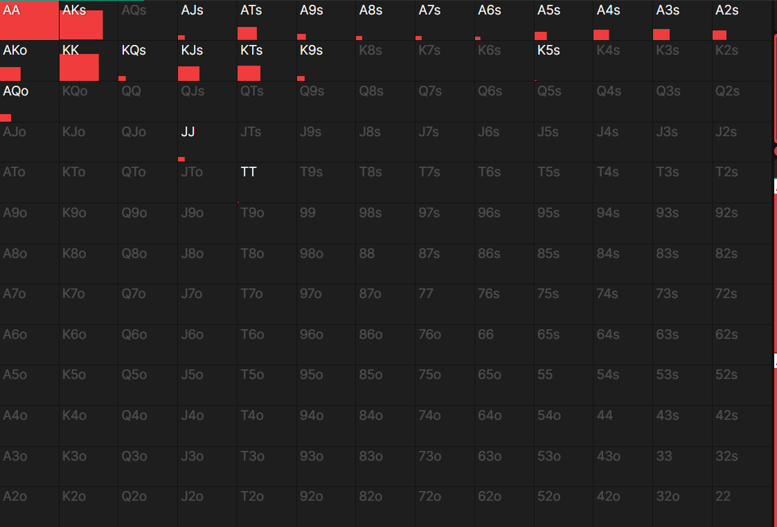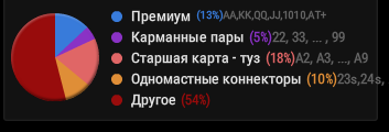 >>50144 Думаю, тут с частотой 100% AQ запихивать надо было - с блокерами на AK, KQ. Велью у меня тут дохуя AK, AA, KK, A3s - итого 21 комба. Добавить 16 блефов AQ - и нармас.