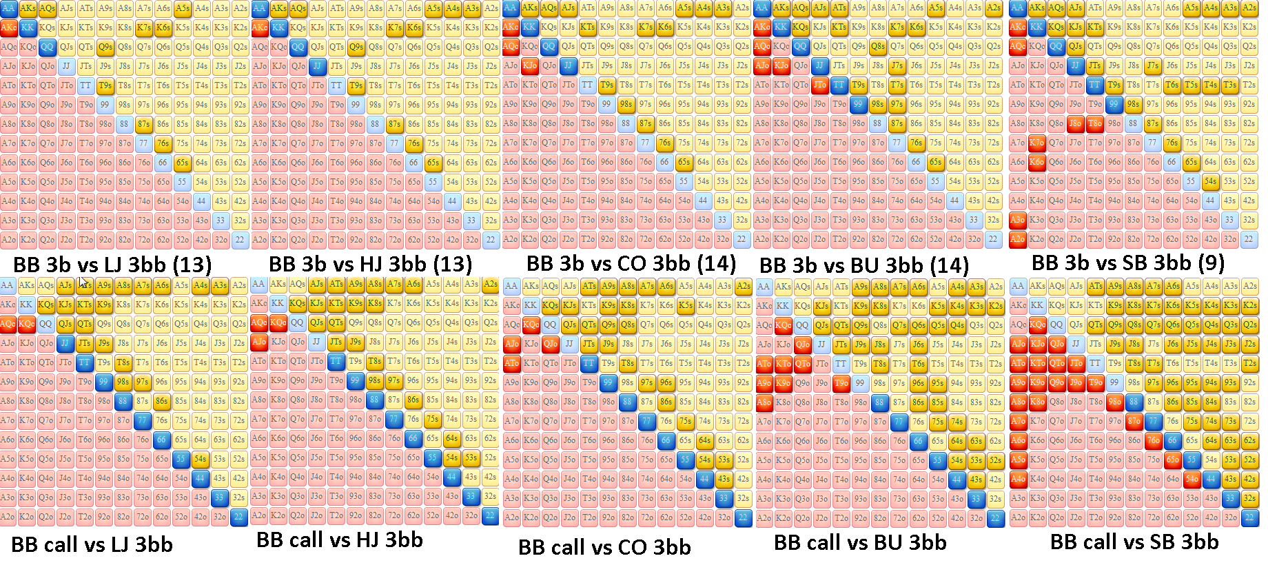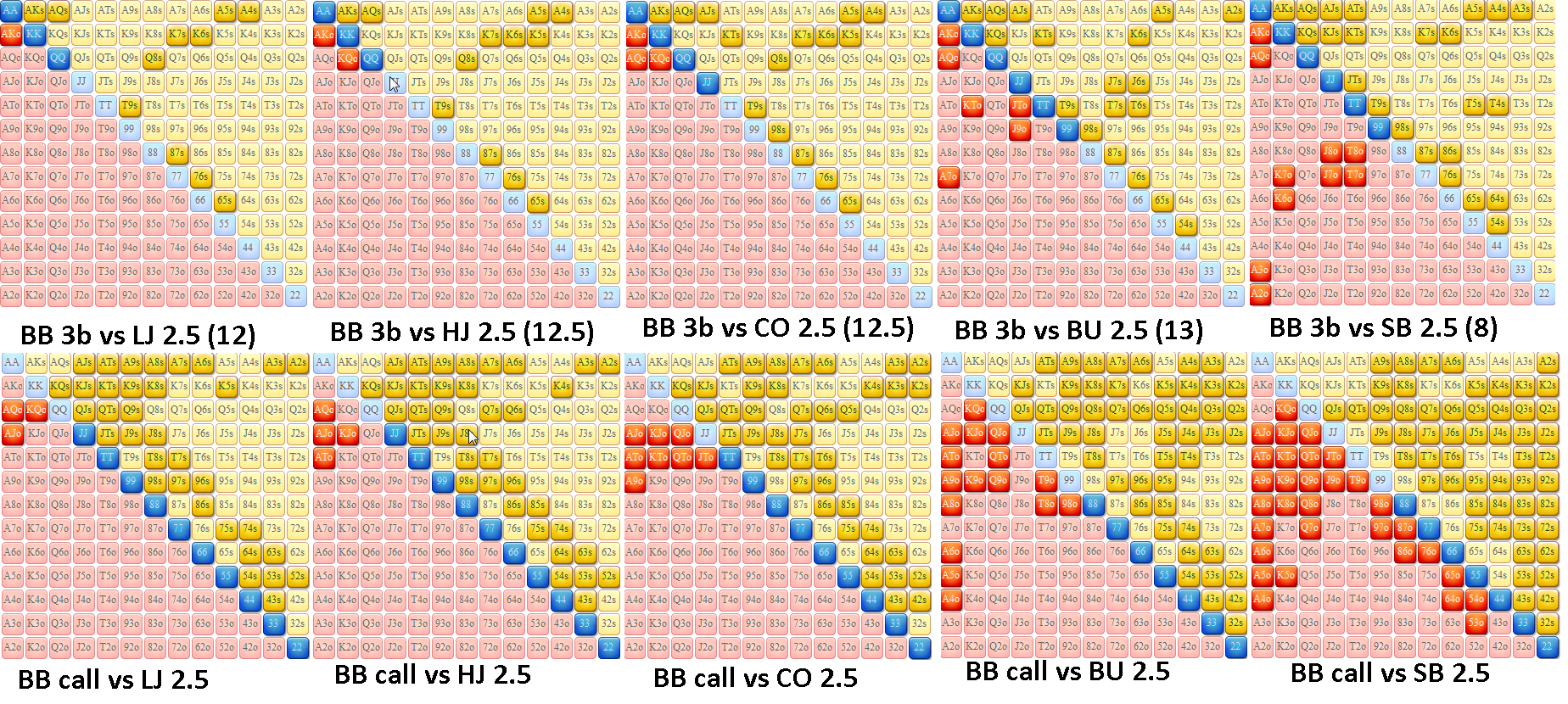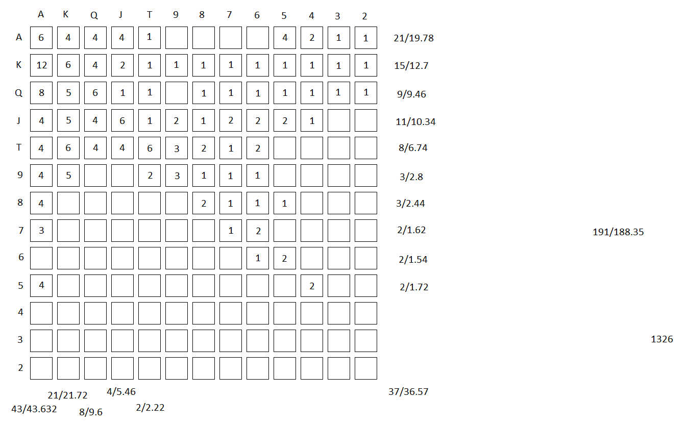 Адаптировал спектр >>50123 под себя, цифры в квадратиках это количество комб которое буду переповышать. Например: KQo - 5 рук из возможных 12, значит 3-бечу с шансом 5/12, то есть когда на рандомайзере выпадет >58