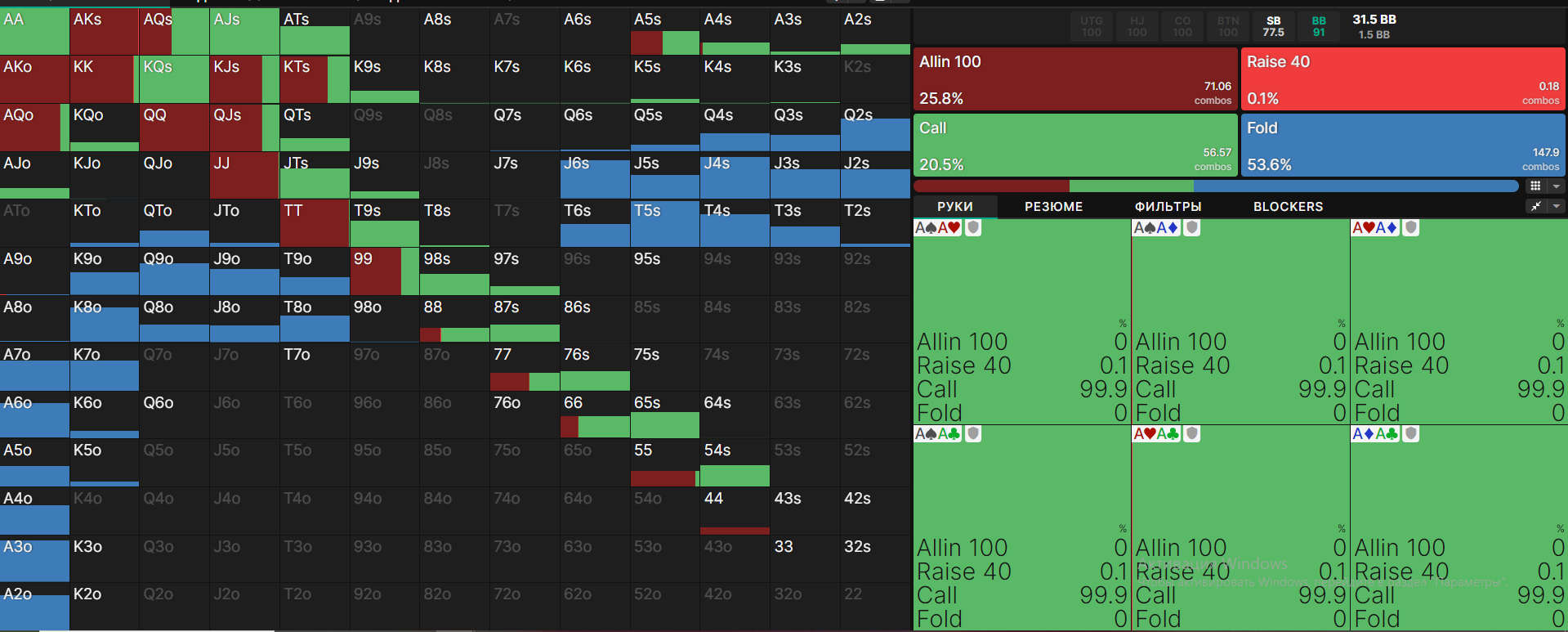 >>50657 >какие руки ты посчитал не обязательными для пуша с КО или БУ допустим В качестве RFI для пуша обязательны все руки с реддита. Под вопросом только 64s с CO, как-то это контринтуитивно, лол, что такая рука в+ играется с ранней. Так же под вопросом низ спектра на SB типа T7o. Может в нормальной структуре блайндов это и прокатит, но на моем лимите структура не 0.5бб/1бб, а 0.4бб/1бб, то есть пушить надо лучше, чем в -40бб/100, на редите посчитан пуш который будет лучше 500bb/100. Но это всё цветочки, на дисерт самое вкусное. Сейчас нет сил писать, го потом напишу.