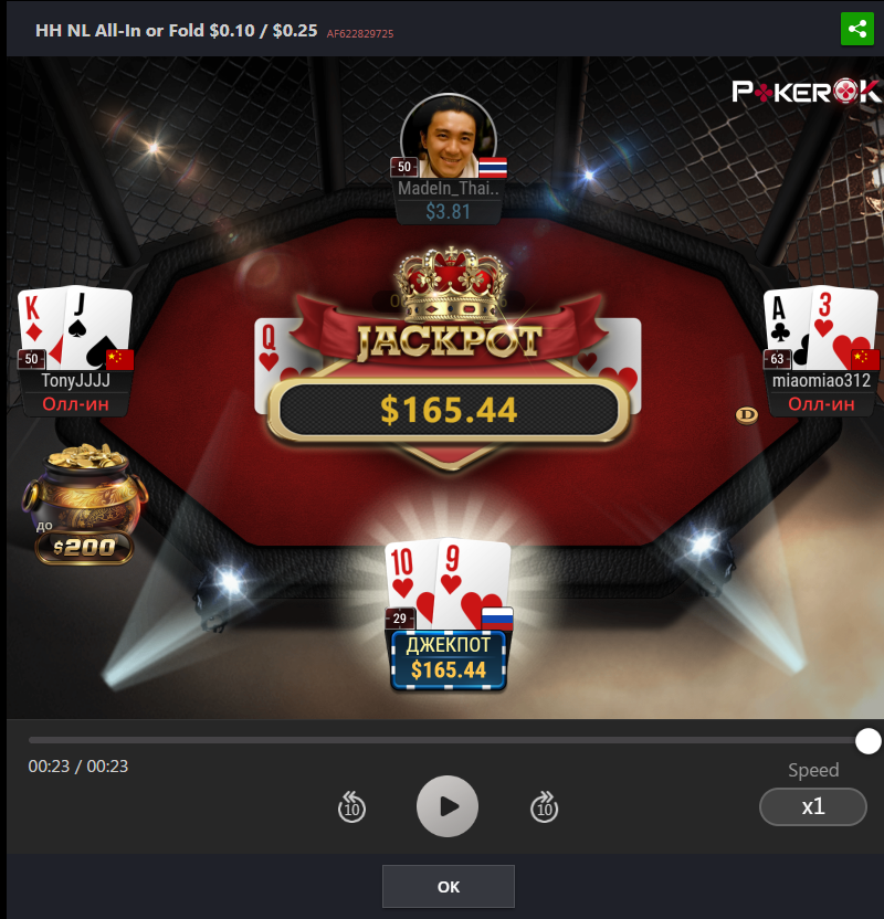 Лимит 0.1/0.25 Сыграно 118441 раздач с винрейтом 4.58/100 evbb. Собрано 14 джекпотов на сумму 2315.75 долларов.