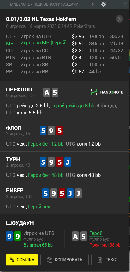 Признаться честно, довольно ебанутая раздача. Во время игры показалось, что утюг в 3бет поте не должен часто попадать в такую низкую доску, а значит он с некоторой вероятностью исполняет хуйню.