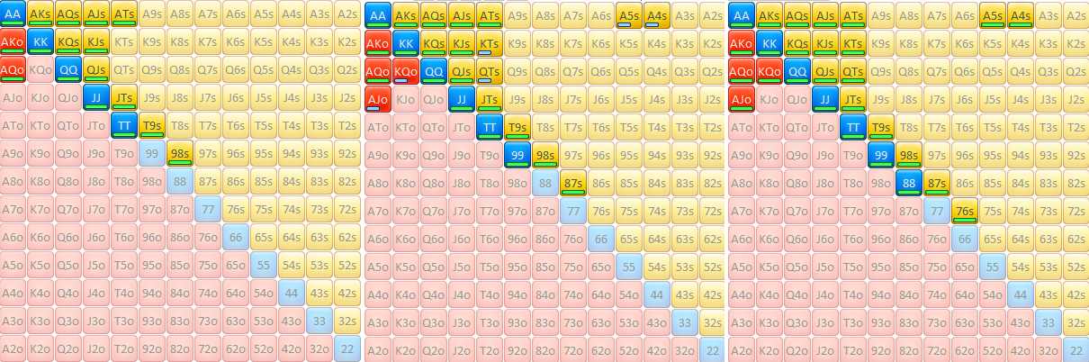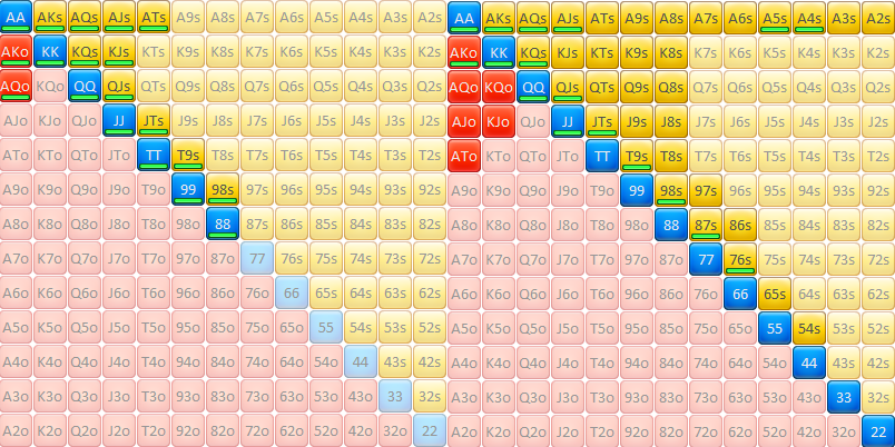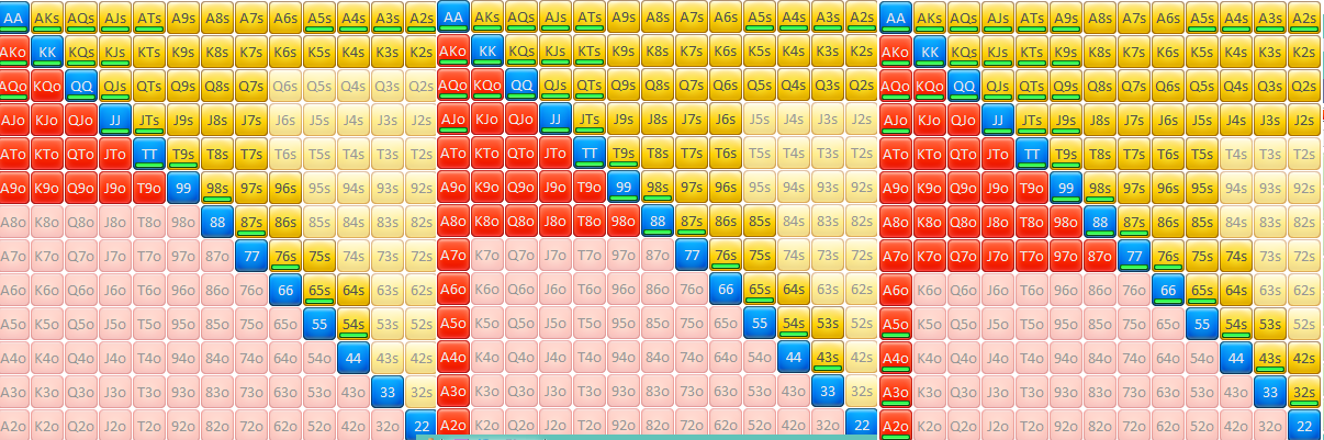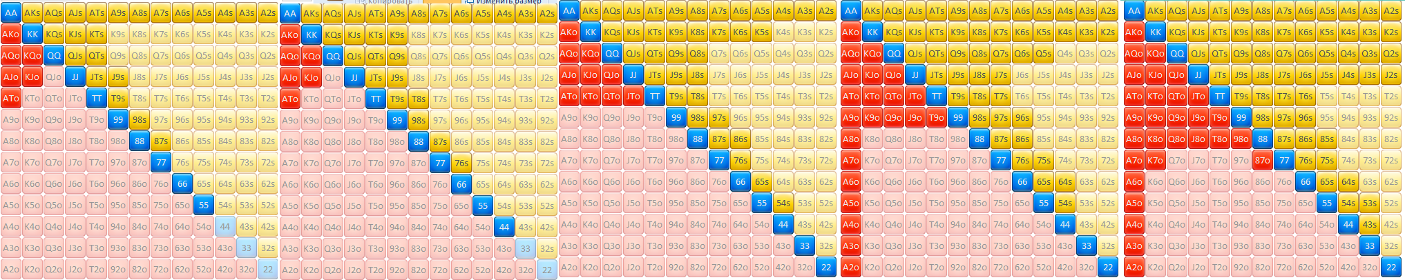 Защита на 3бет, зелёное и красное - 4бет, серое 4бет без позы и колл в позе, желтое - колл, оранжевое колл только в позе.Да у меня почти одинаковые ренжи в ранних, но кого это ебёт? Мне так удобно.